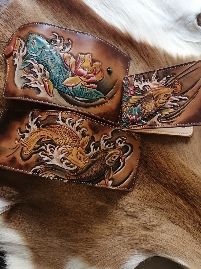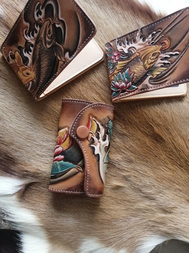 Crafted from high-quality leather, this handmade tooled wallet features an intricately carved carp, symbolizing strength, perseverance, and good fortune in traditional culture. The detailed craftsmanship and bold design make it a statement piece for anyone who appreciates unique leather goods.
