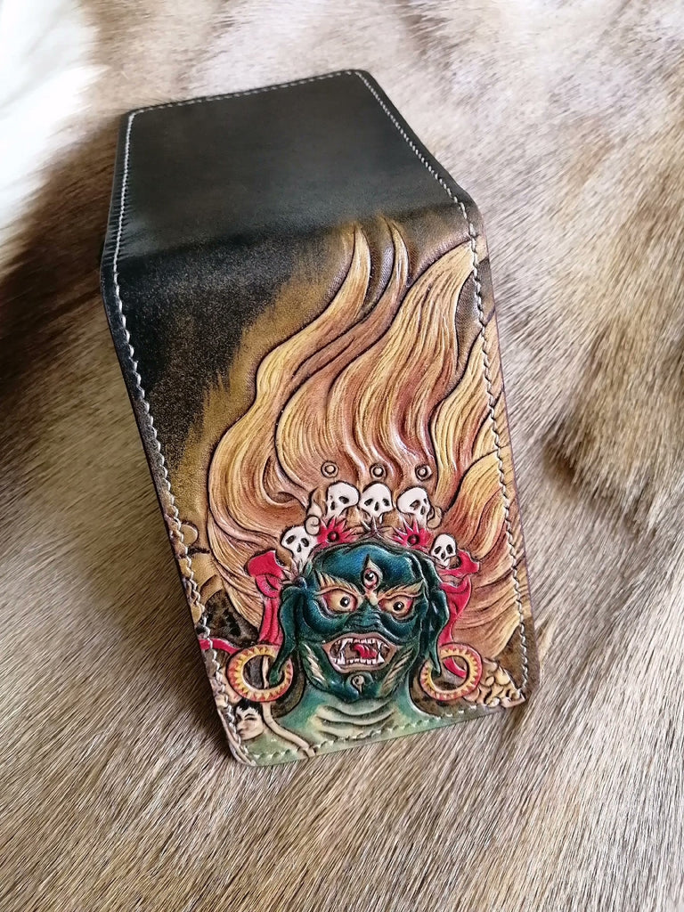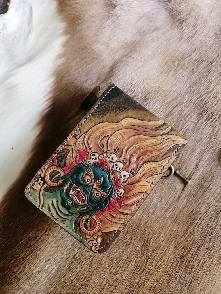 Mahakala Wallet Tooled Leather Wallet Card Wallet with ID Window Mahakala Deity Wallet ID Holder Wallet Mens Wallet with ID Window