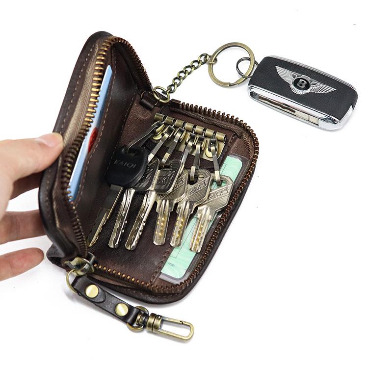 Style: Vintage Brown Leather Men's Car Key Wallet Black Key Zipper Wallet For Men