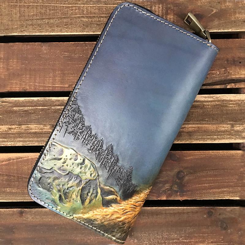 Design: Blue Handmade Tooled Wolf Leather Long Wallet Zipper Wallet Clutch Wallet For Men