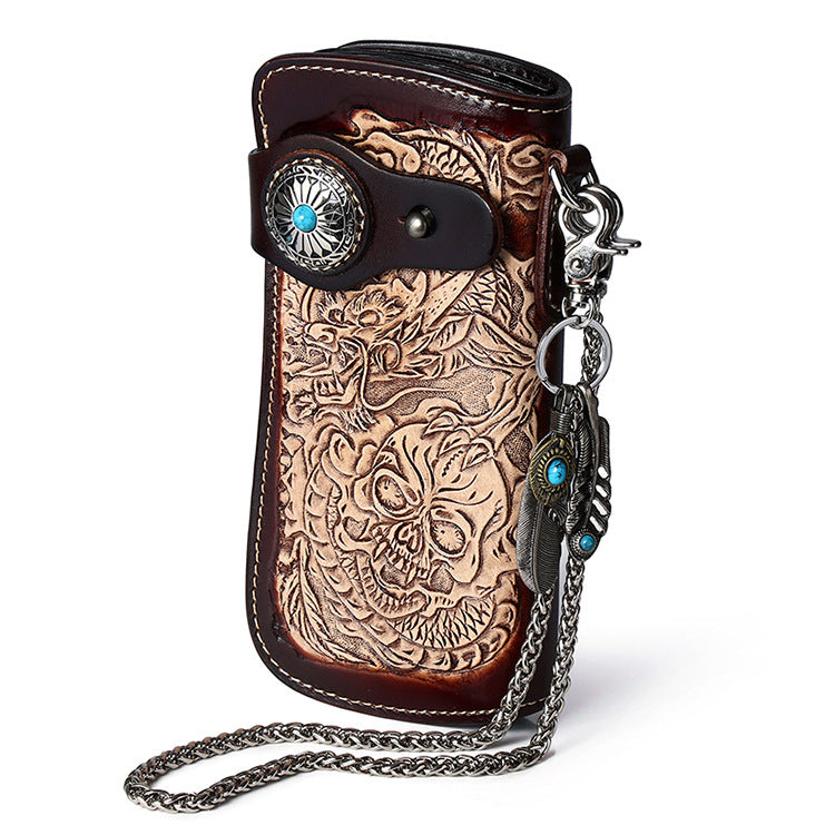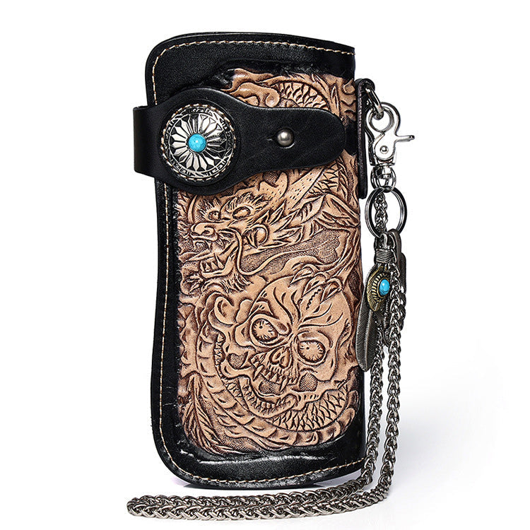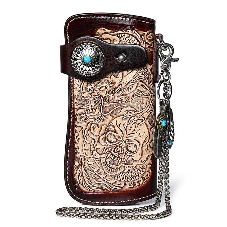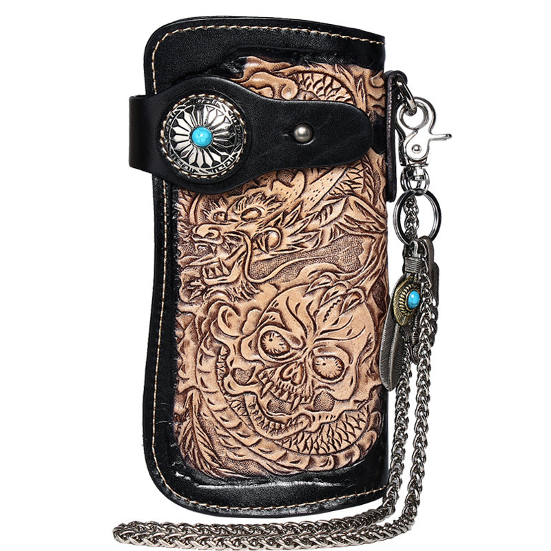 Style: Cool Leather Tooled Dragon&Skull Biker Wallet Handmade Biker Chain Wallet for Men