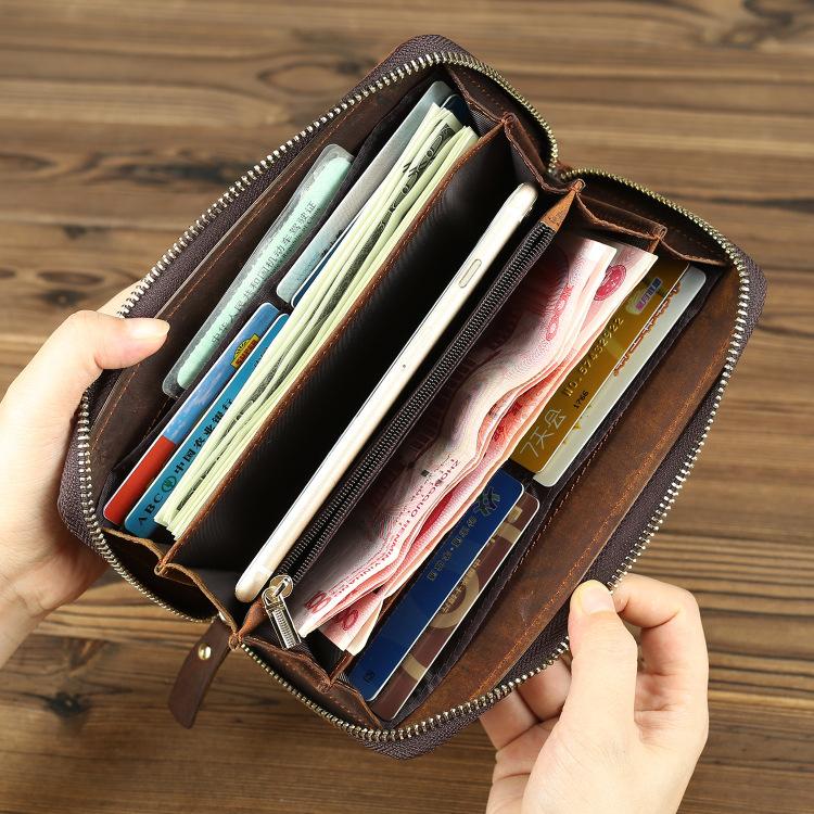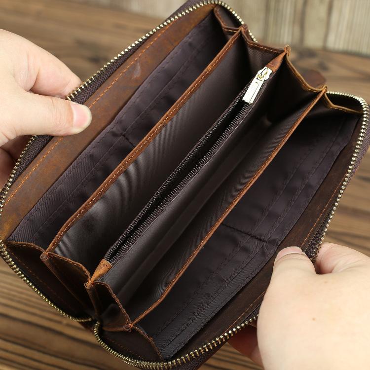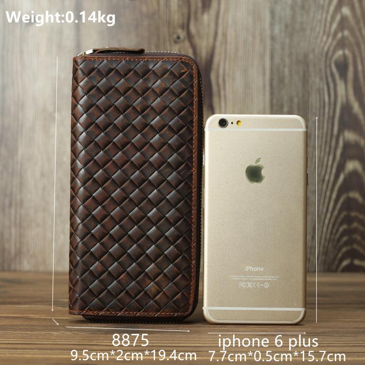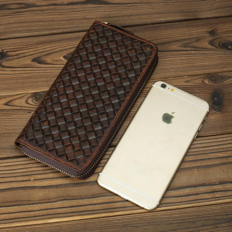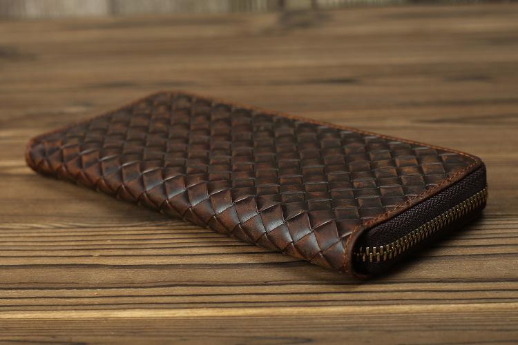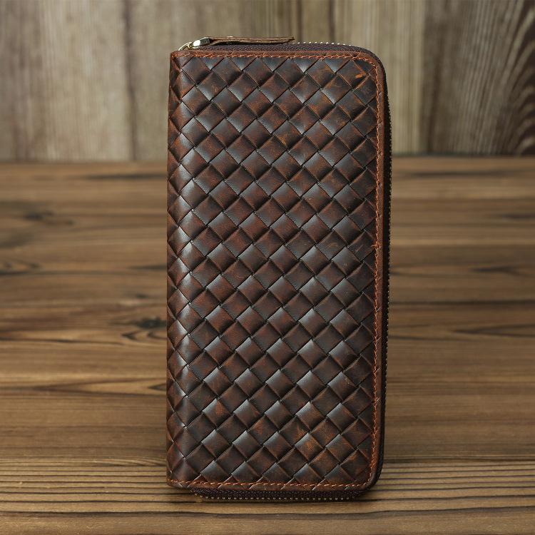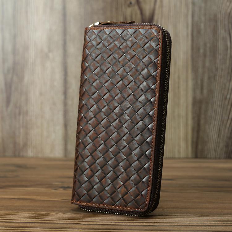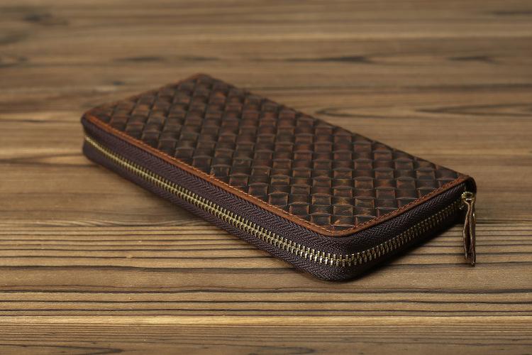 Design: Dark Brown Leather Long Wallet for Men Woven Bifold Long Wallet Brown Multi-Card Wallet For Men