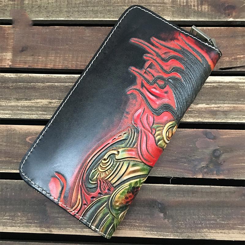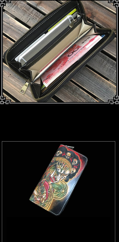 Style: Handmade Black Mahākāla Wolf Leather Long Wallet Clutch Zipper Wallet For Men