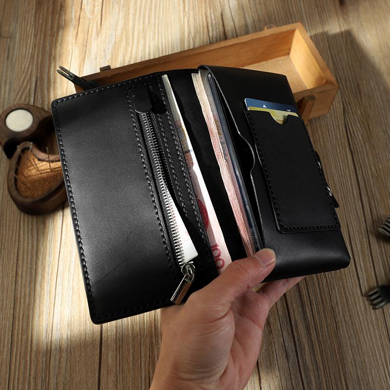 Style: Handmade Coffee Leather Mens Bifold Long Wallets Personalized Black Checkbook Leather Wallets for Men