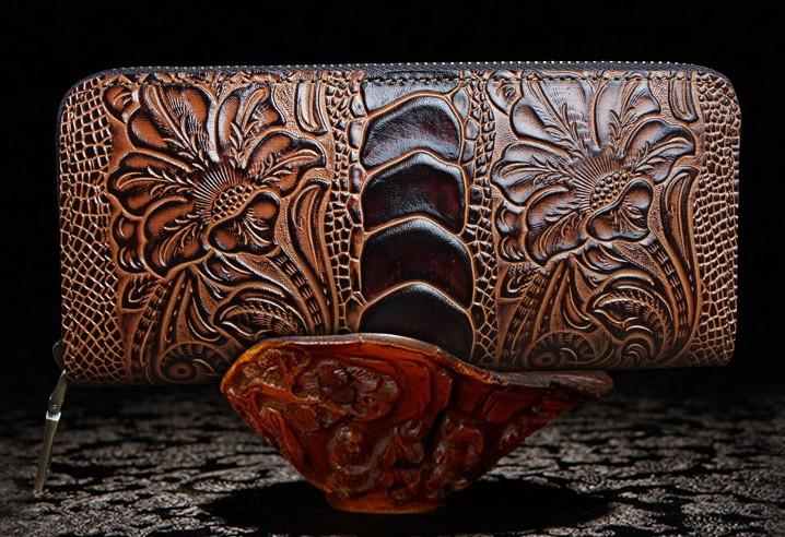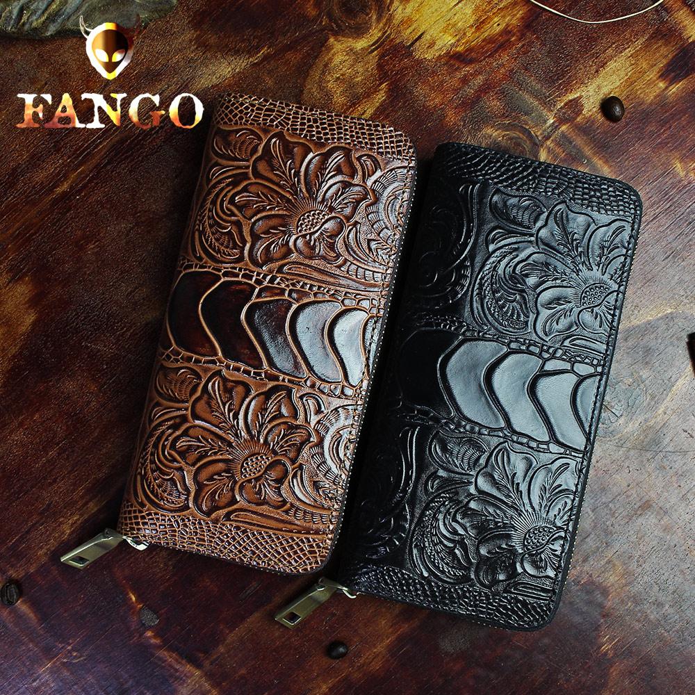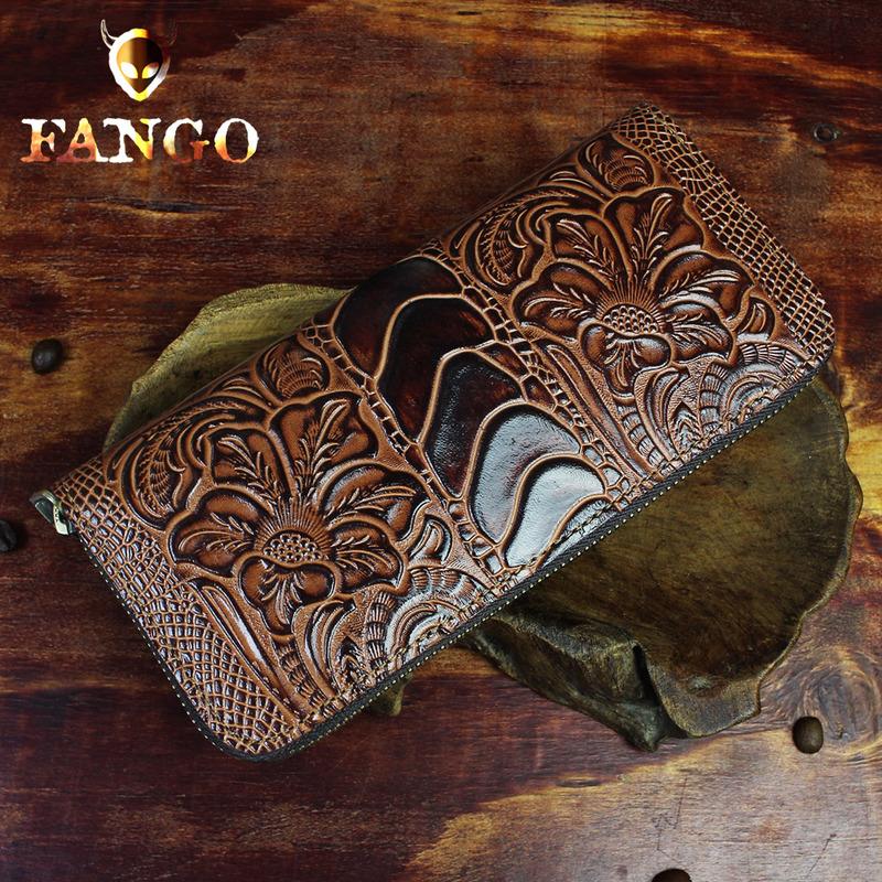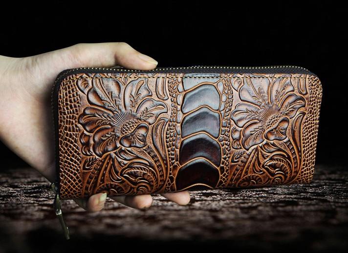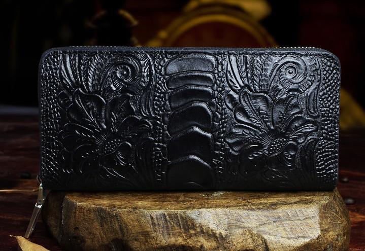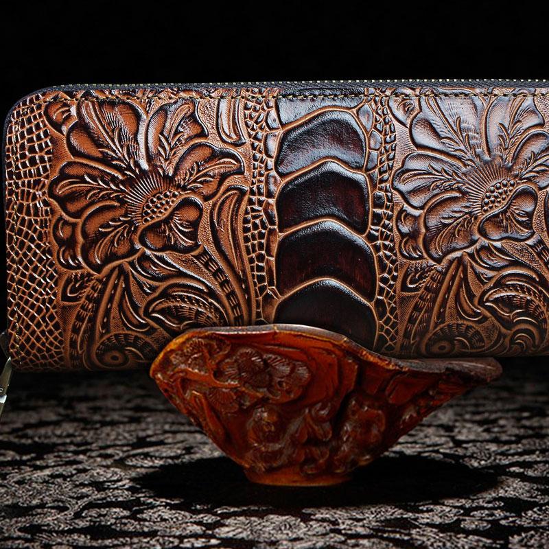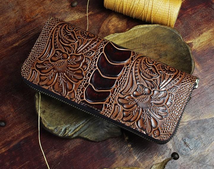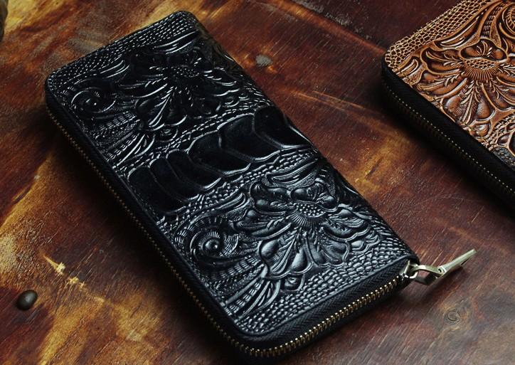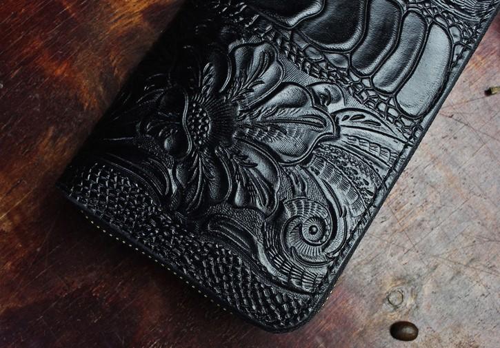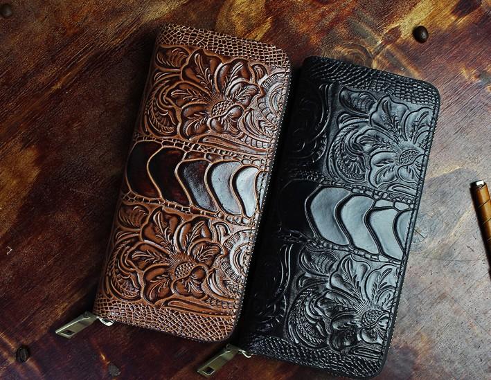 Design: Handmade Leather Floral Mens Cool Zipper Phone Travel Long Wallet Card Holder Card Slim Clutch Wallets for Men