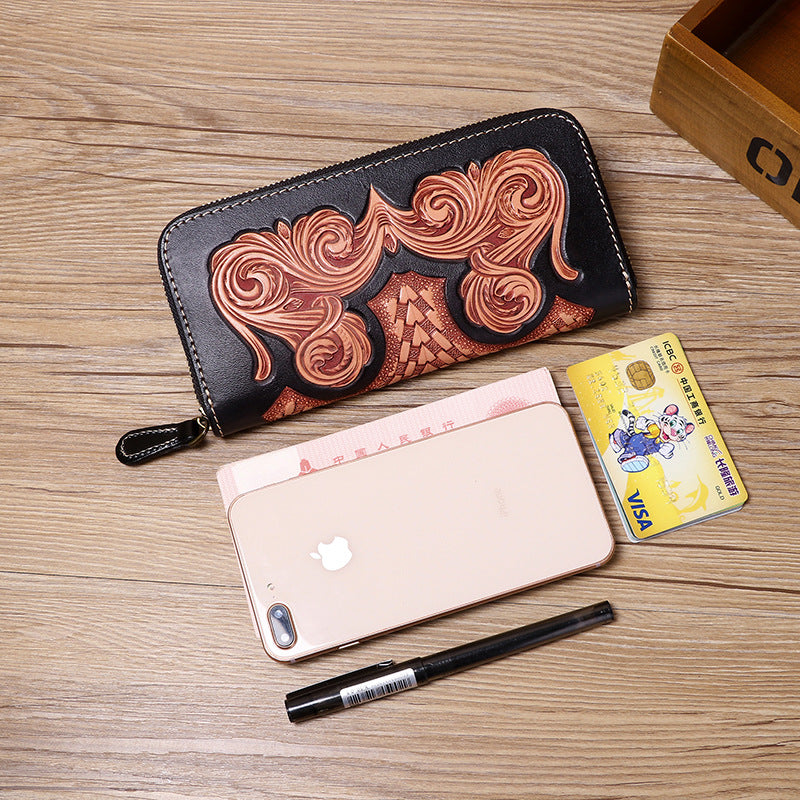 Handmade Leather Floral Tooled Zipper Around Long Wallets Cool Clutch Zipper Wallet for Men