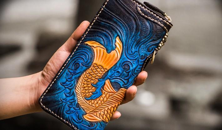 Style: Handmade Leather Men Tooled Carp Cool Leather Wallet Long Phone Wallets for Men