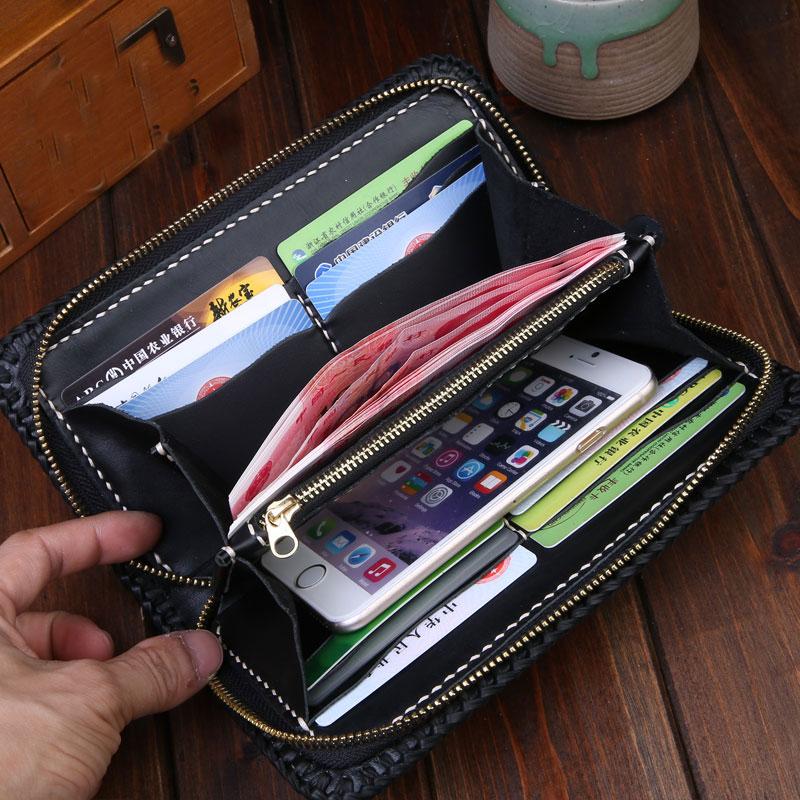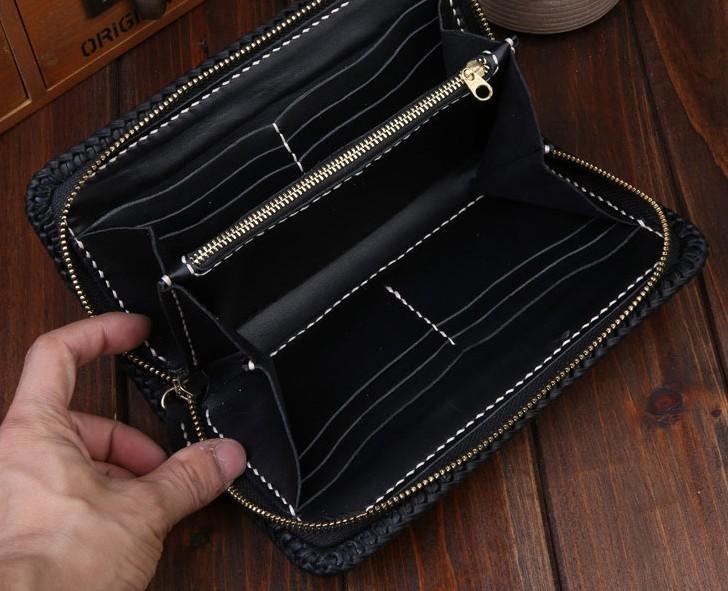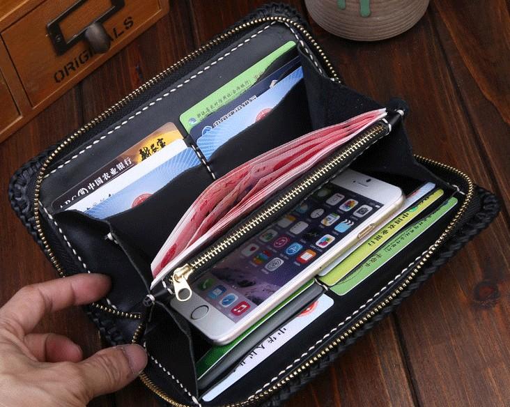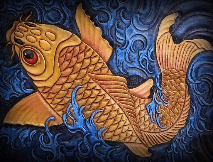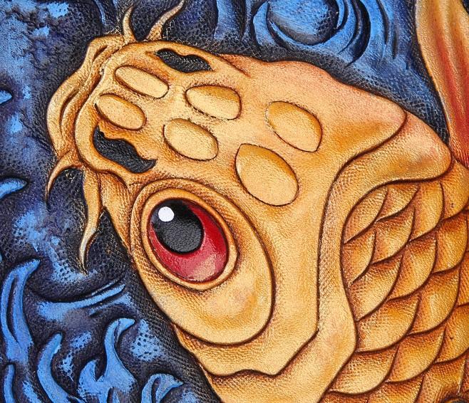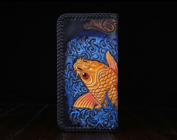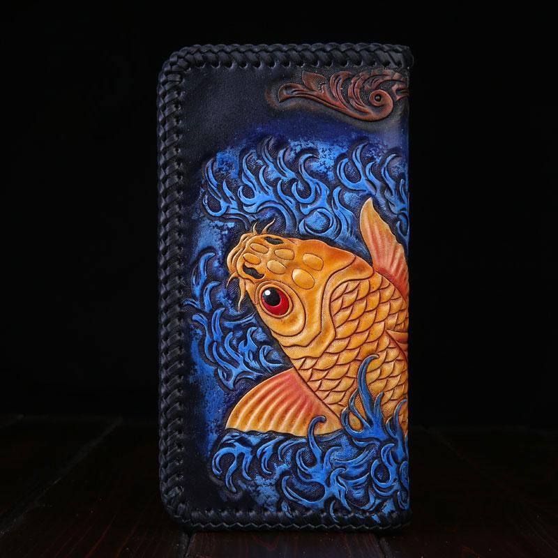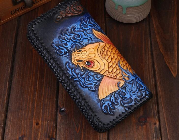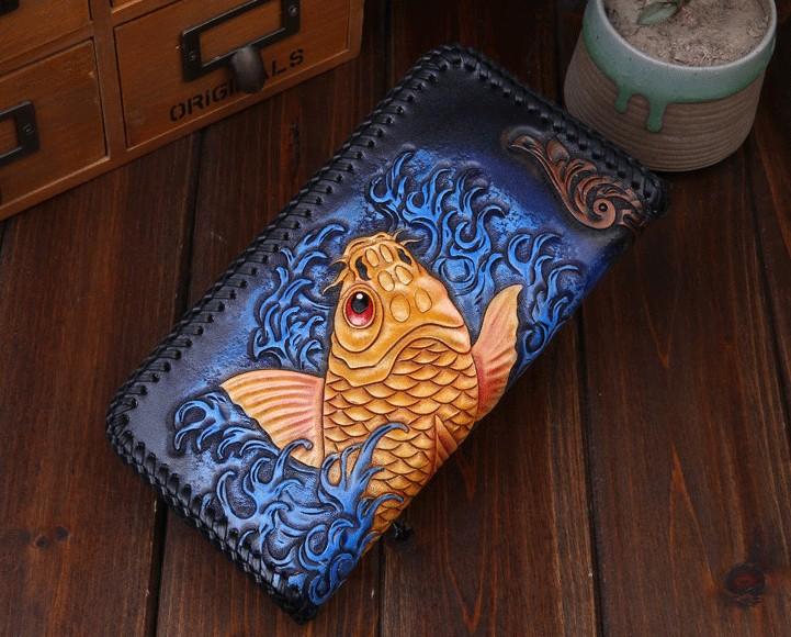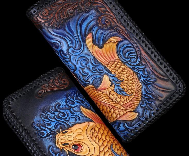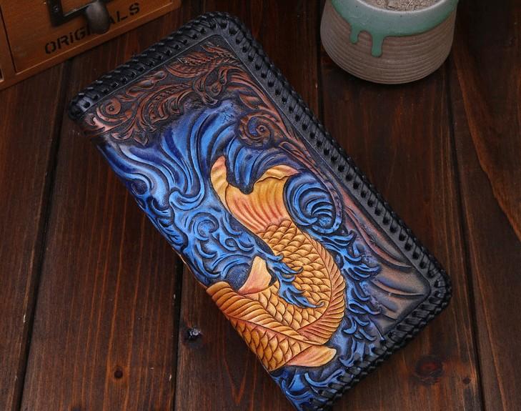 Design: Handmade Leather Mens Clutch Wallet Tooled Cool Carp Wallet Long Zipper Wallets for Men