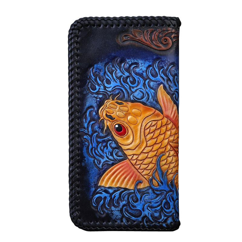 Style: Handmade Leather Mens Clutch Wallet Tooled Cool Carp Wallet Long Zipper Wallets for Men