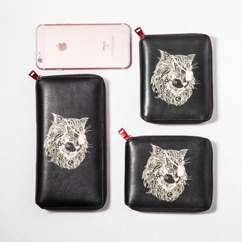 Design: Handmade Leather Cat Mens Cool Long Leather Wallet Bifold Clutch Wallet for Men