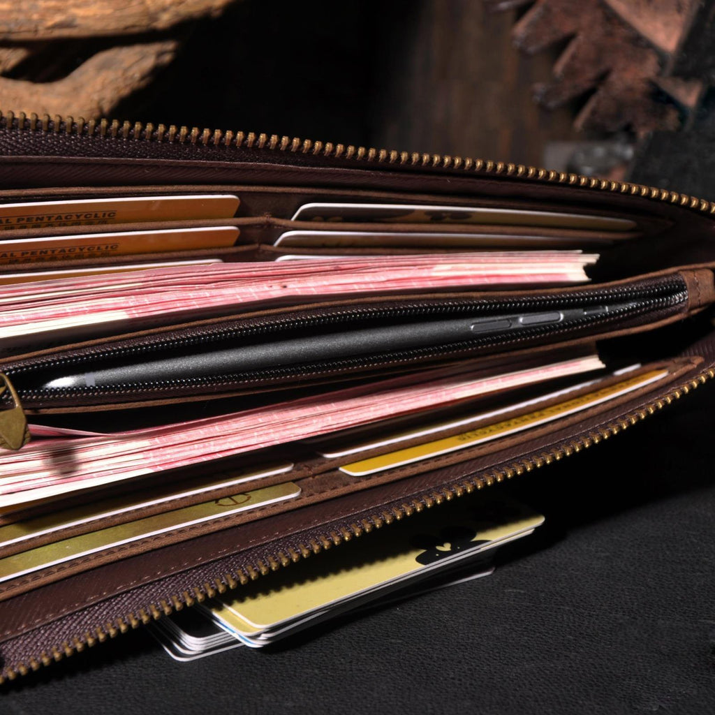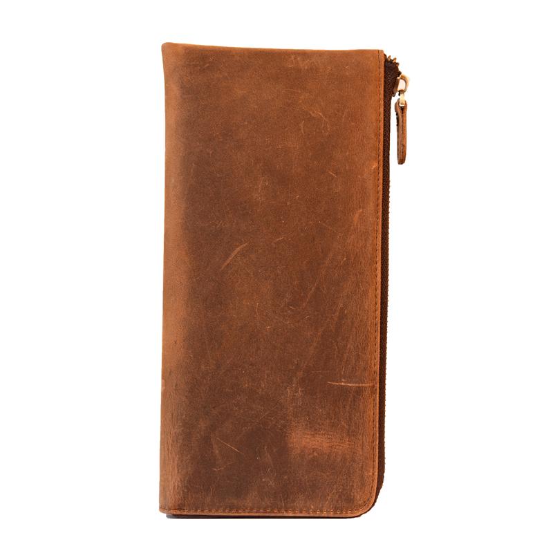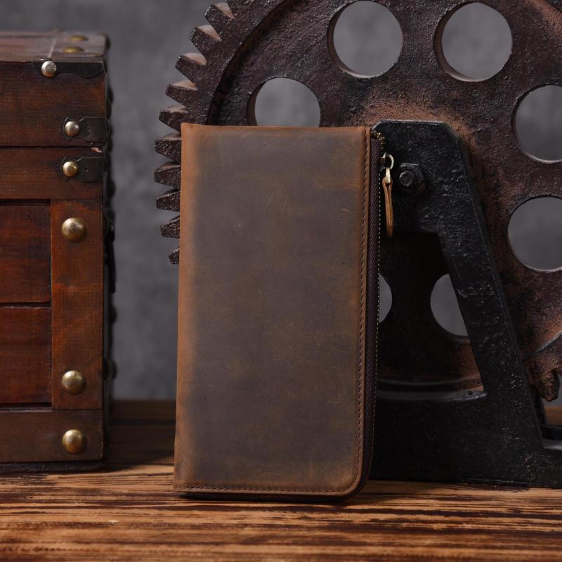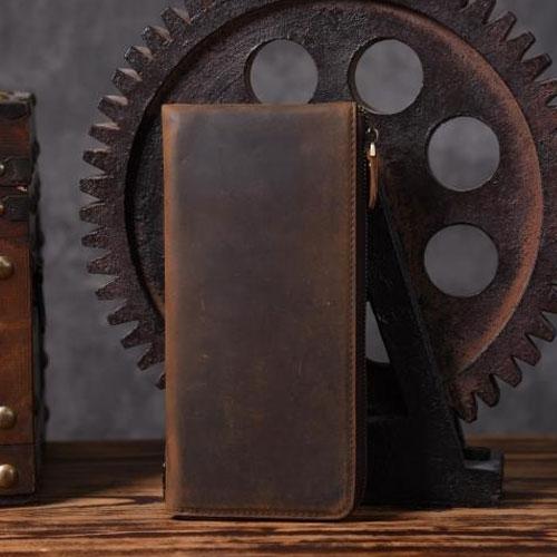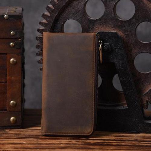Handmade Leather Mens Cool Long Leather Wallet Zipper Clutch Wallet for Men