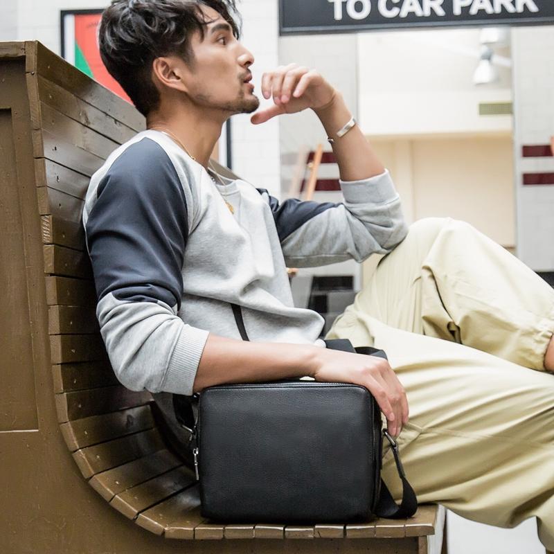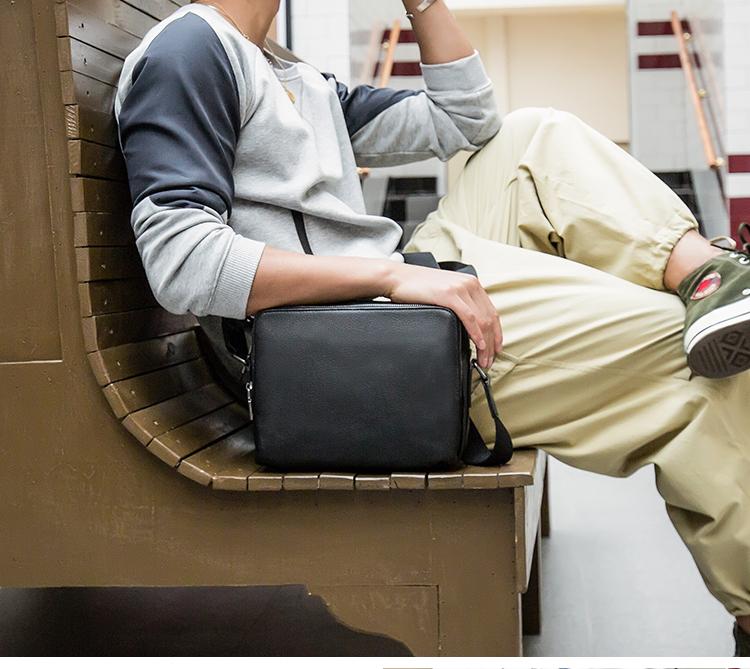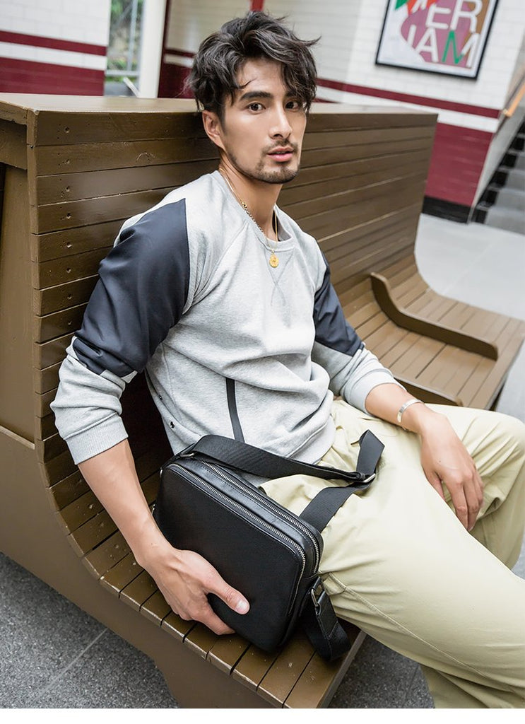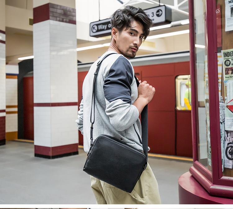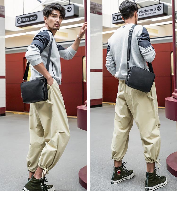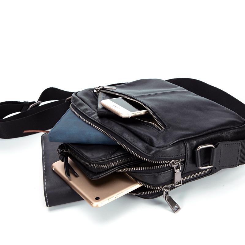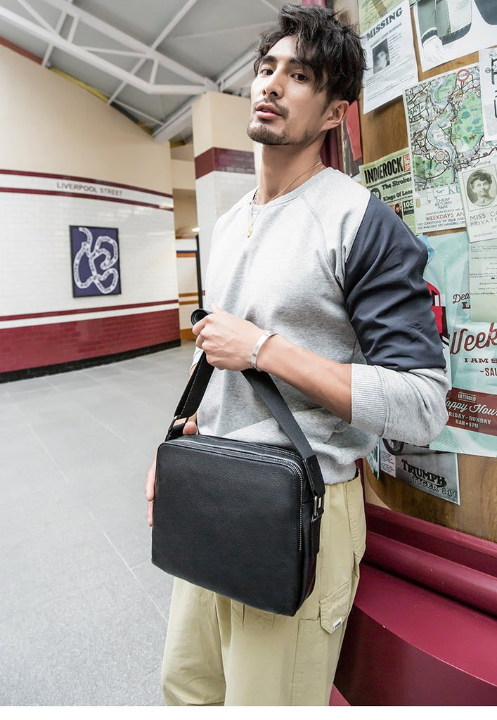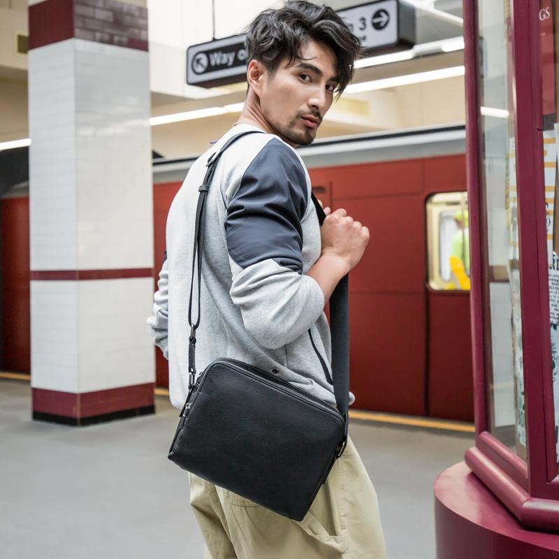 Design: Black Cool Leather Mens 10 inches Horizontal Bag Postman Bag Black Messenger Bags Side Bag for Men