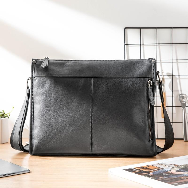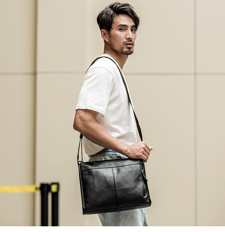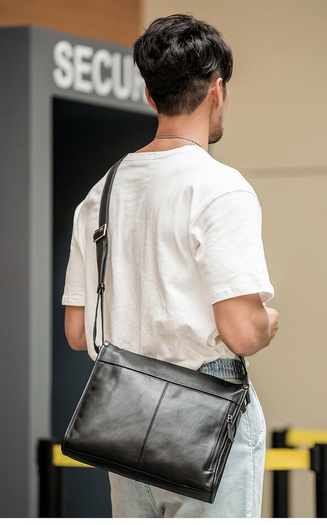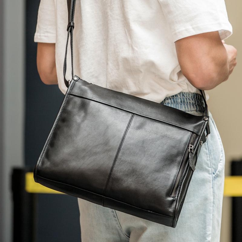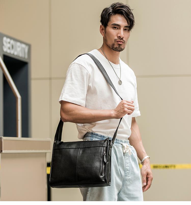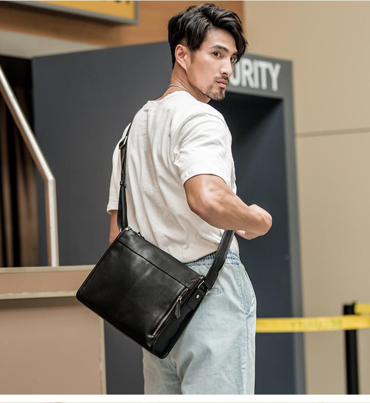 Design: Black Cool Leather Mens 12 inches Side Bag Messenger Bags Black Postman Bags Crossbody Bag for Men