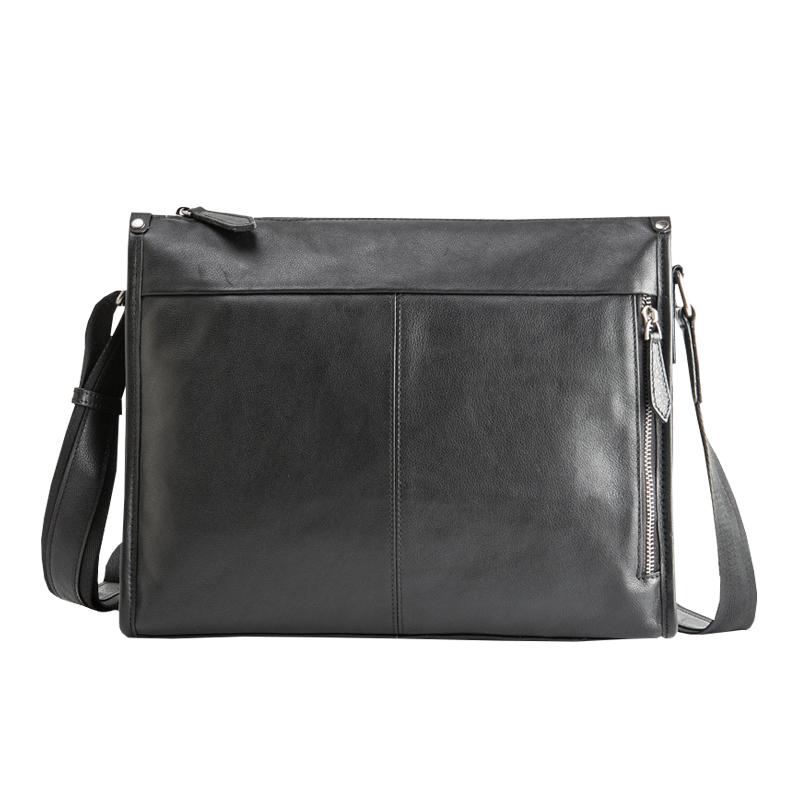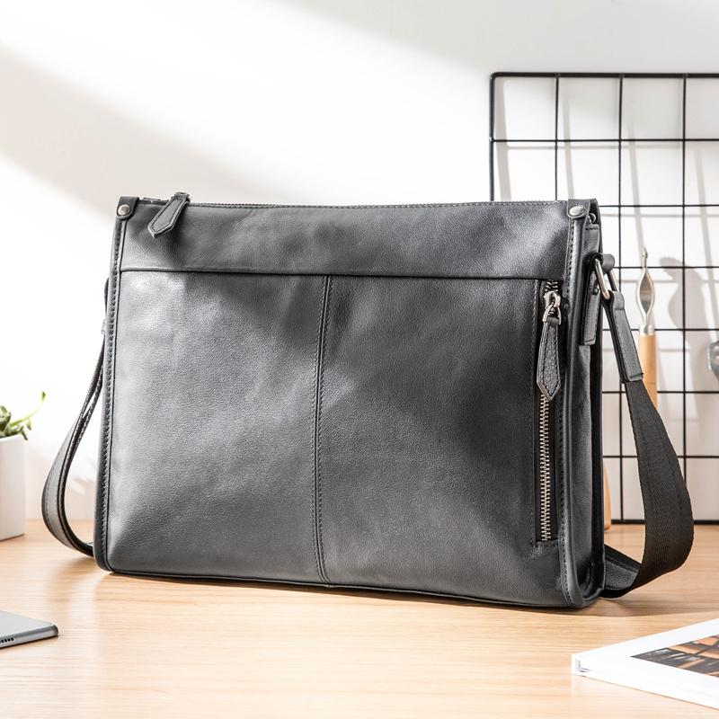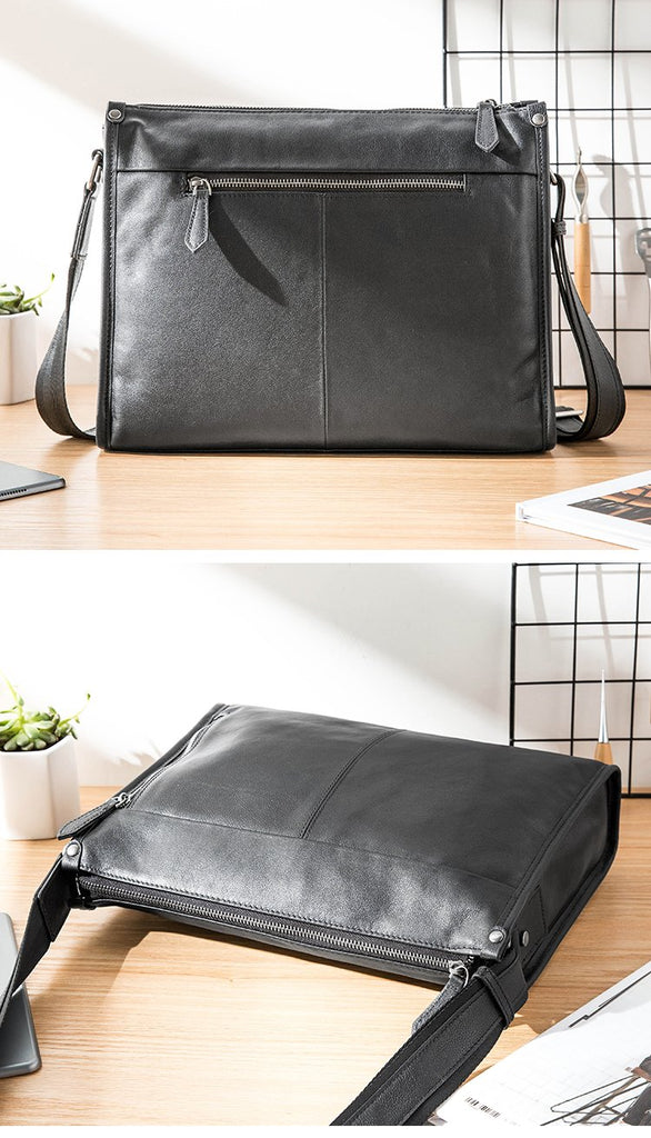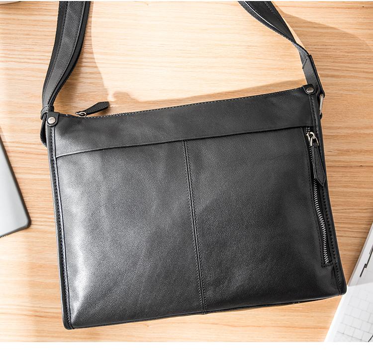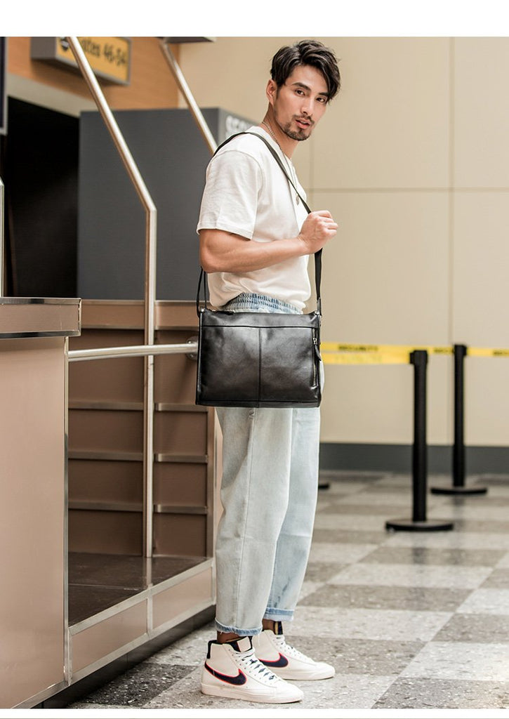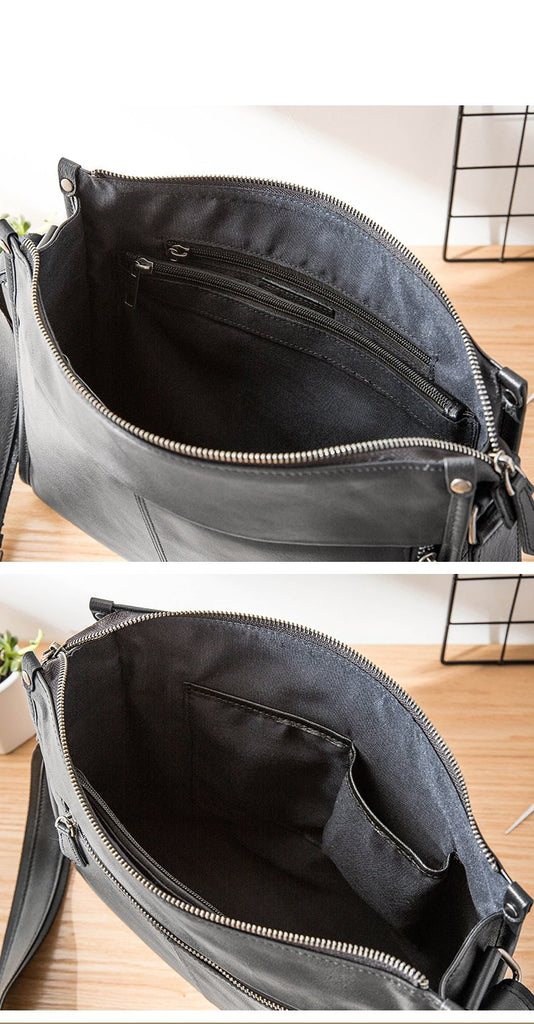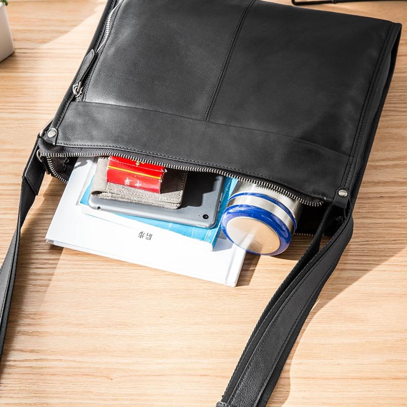 Design: Black Cool Leather Mens 12 inches Side Bag Messenger Bags Black Postman Bags Crossbody Bag for Men