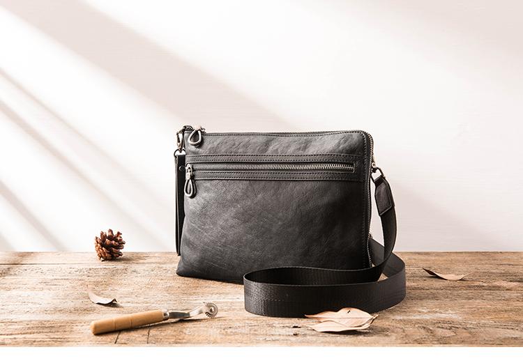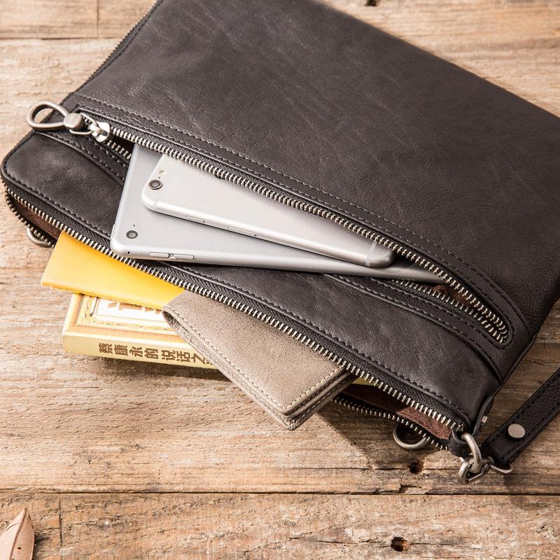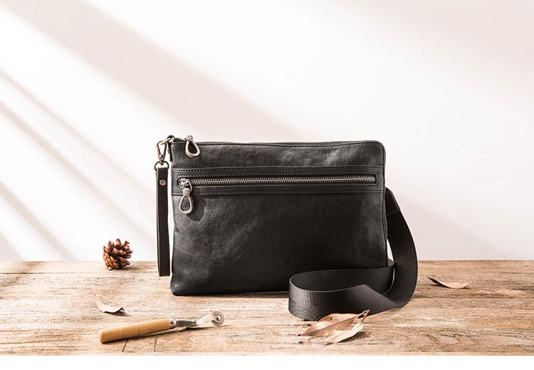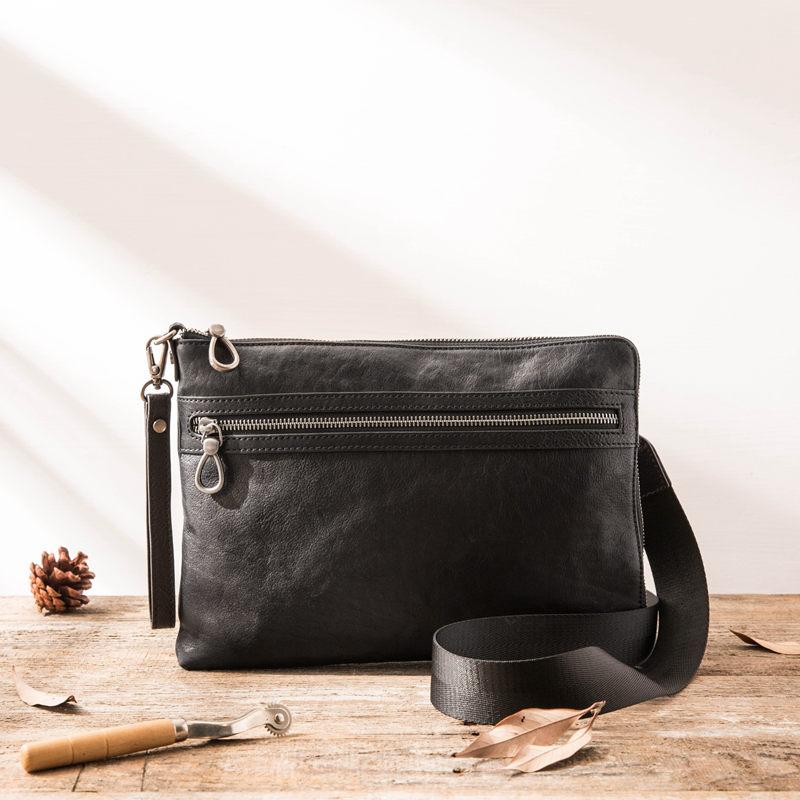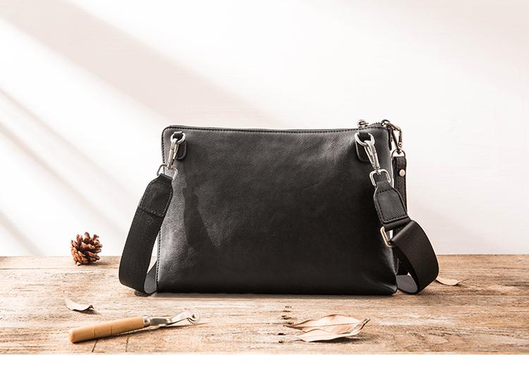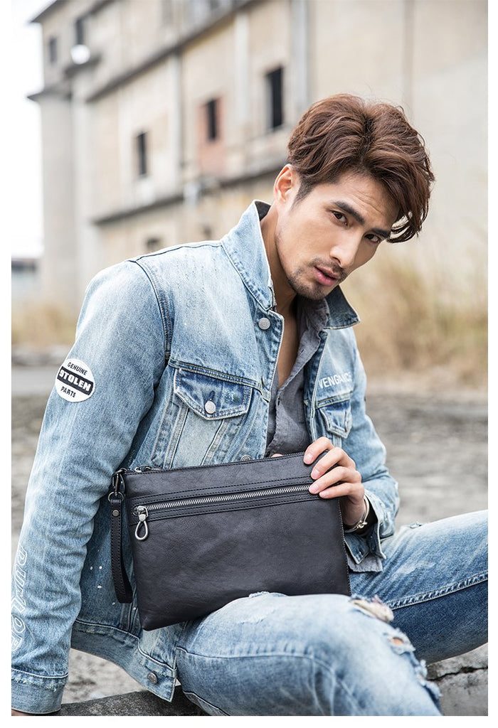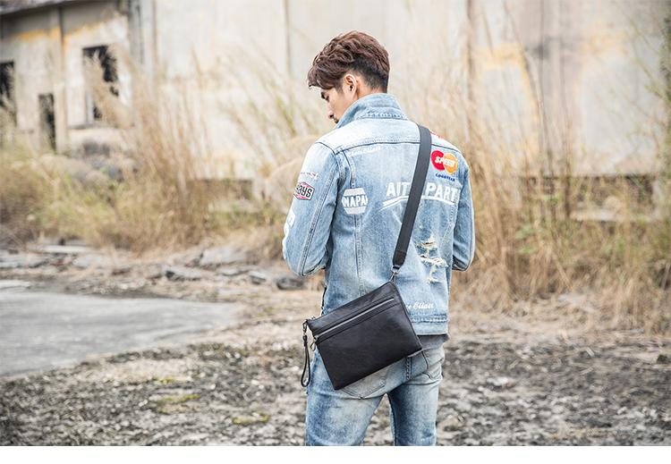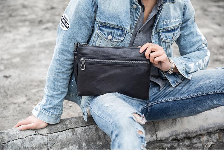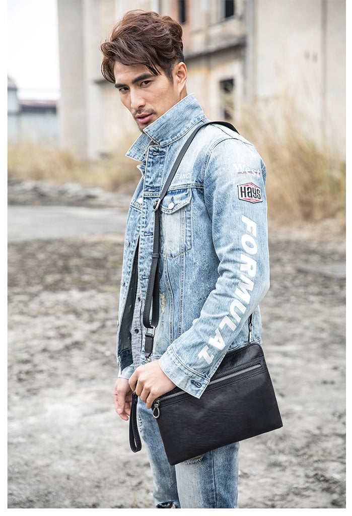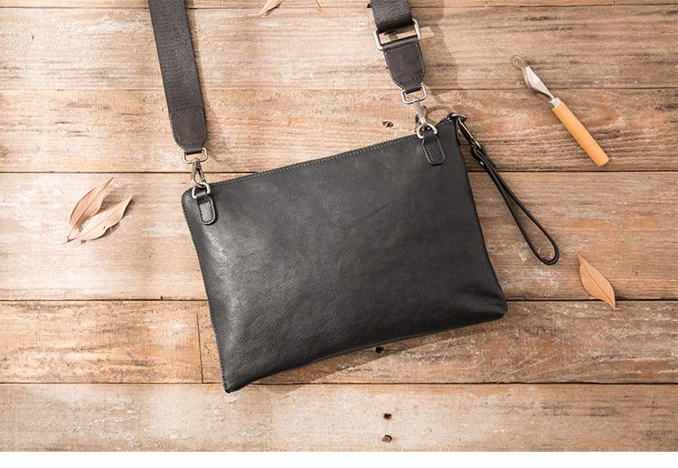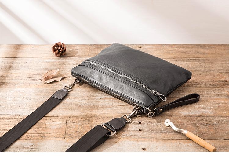 Black Cool Leather Mens Wristlet Bag Clutch Black Slim Messenger Bag Side Bag for Men