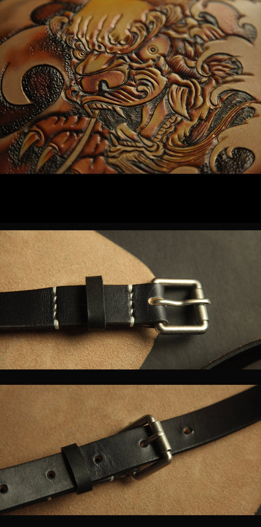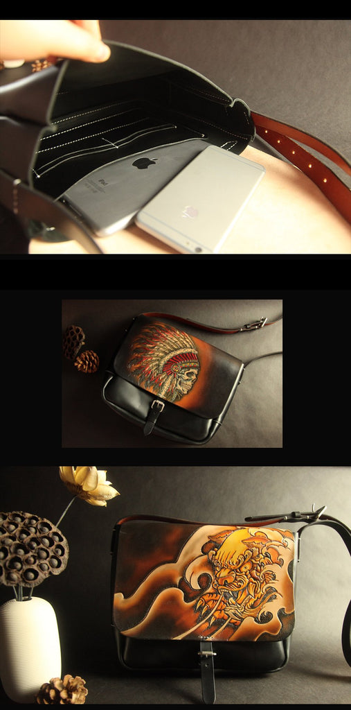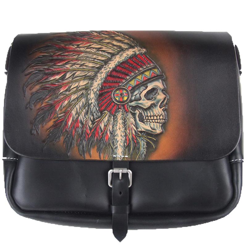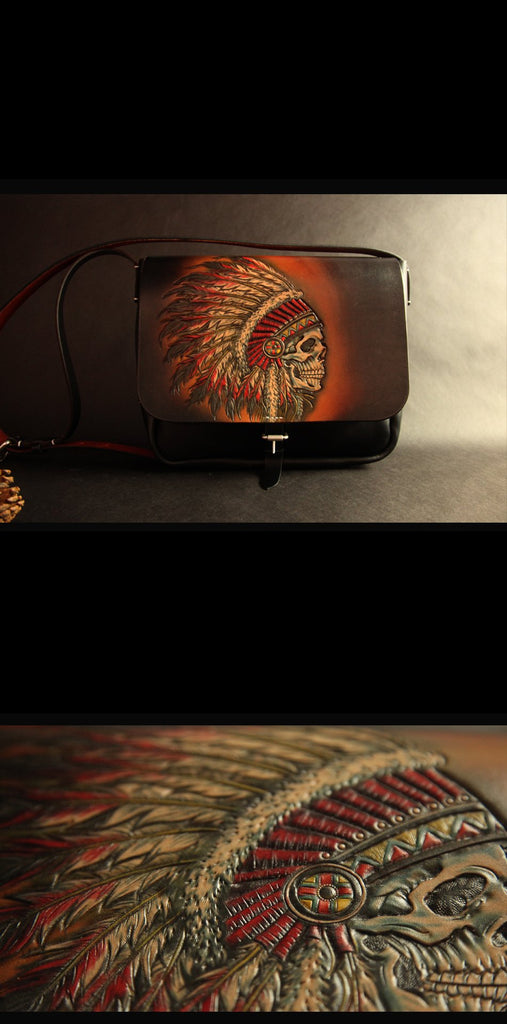 Style: Handmade Black Tooled Indian Chief Skull Leather Courier Bag Messenger Bag For Men