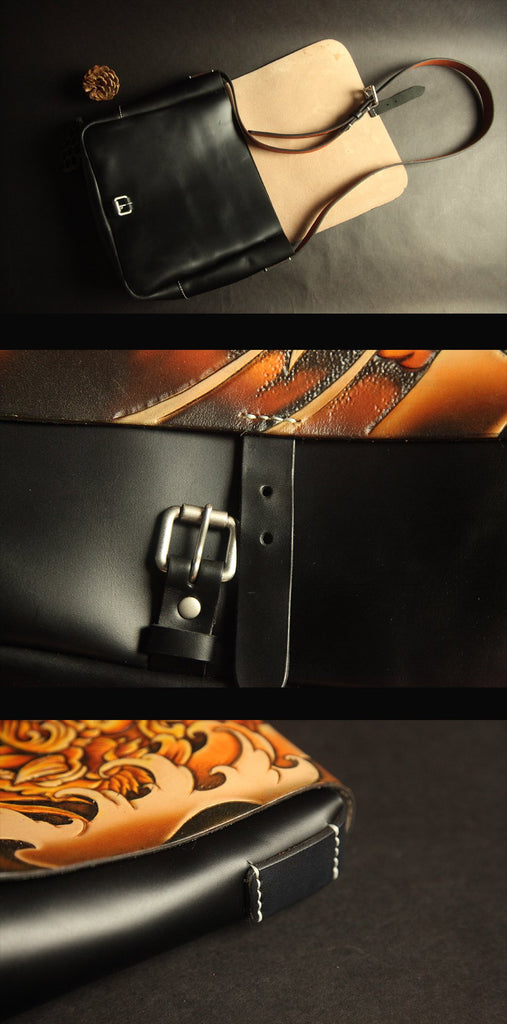 Design: Handmade Black Tooled Indian Chief Skull Leather Courier Bag Messenger Bag For Men