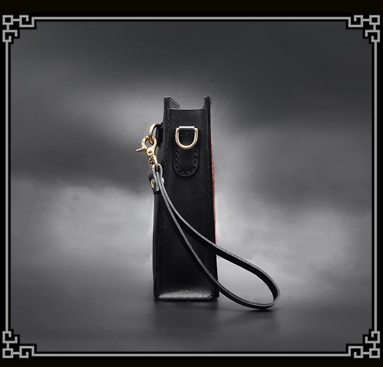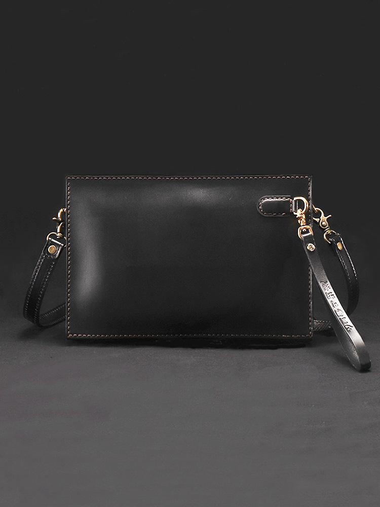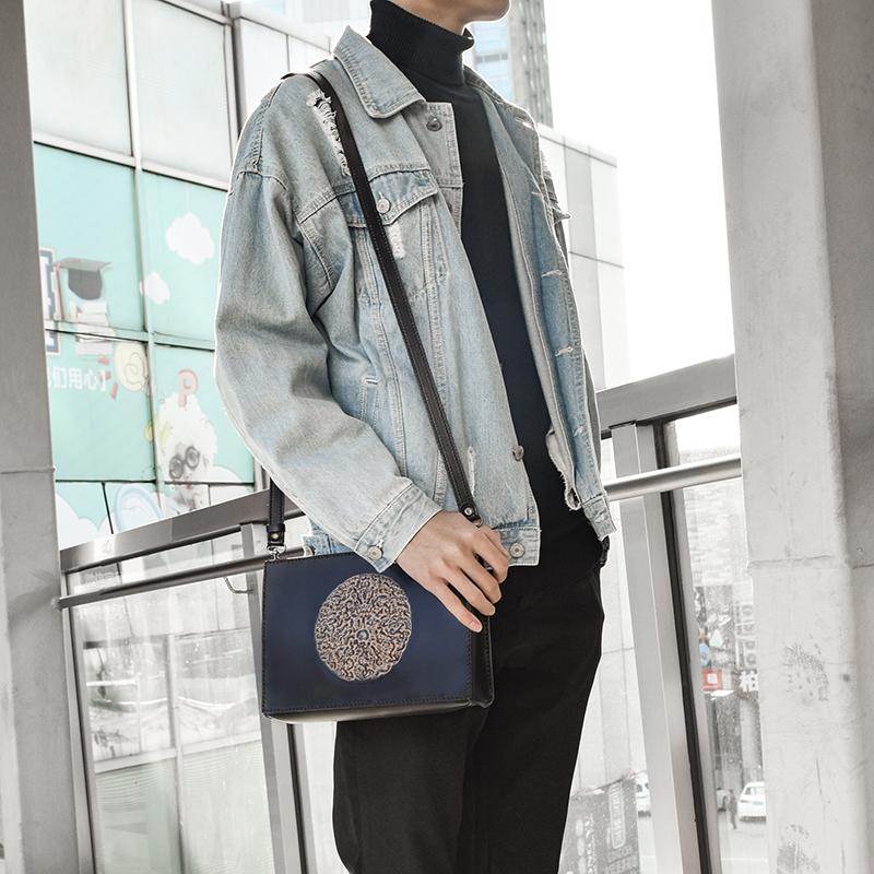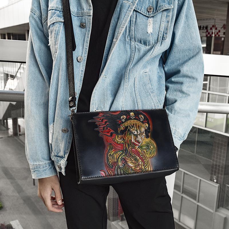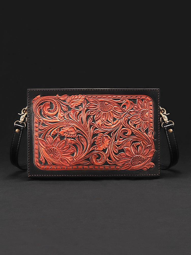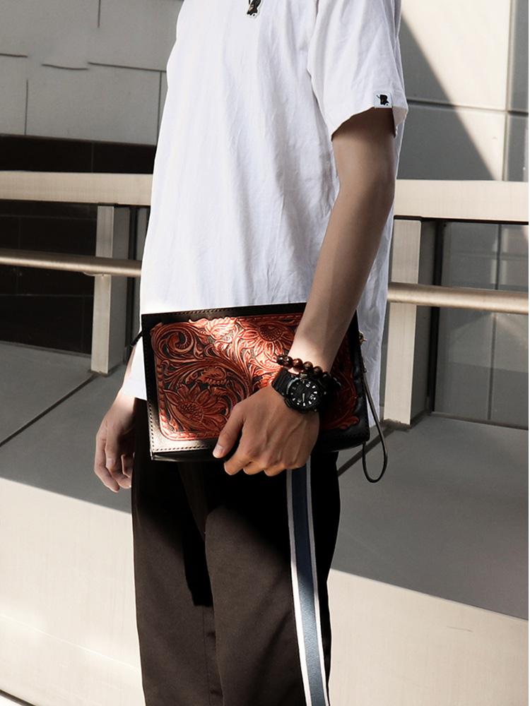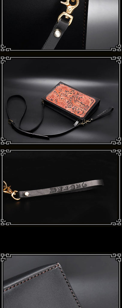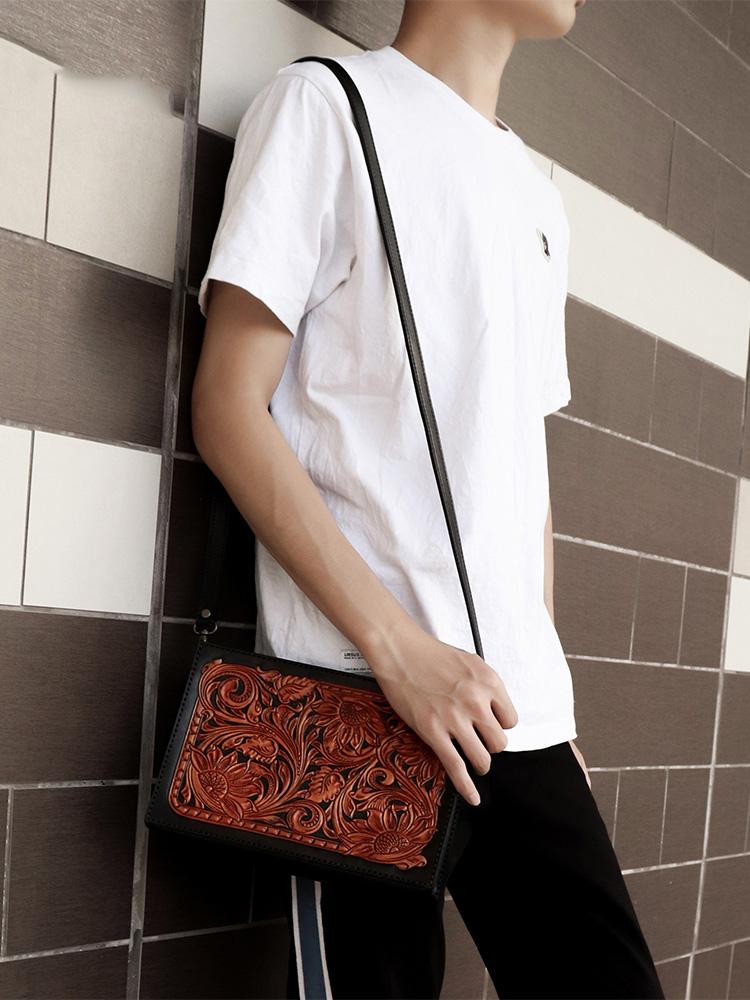Design: Handmade Black Tooled Floral Leather Messenger Bags Side Bag Clutch Wristlet Bag For Men