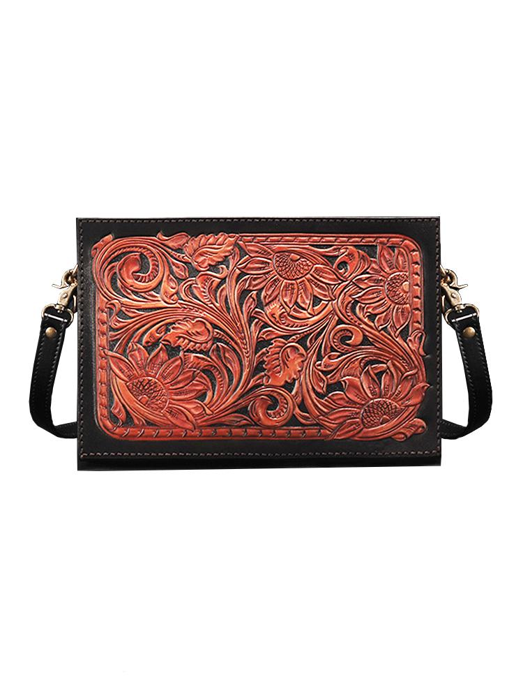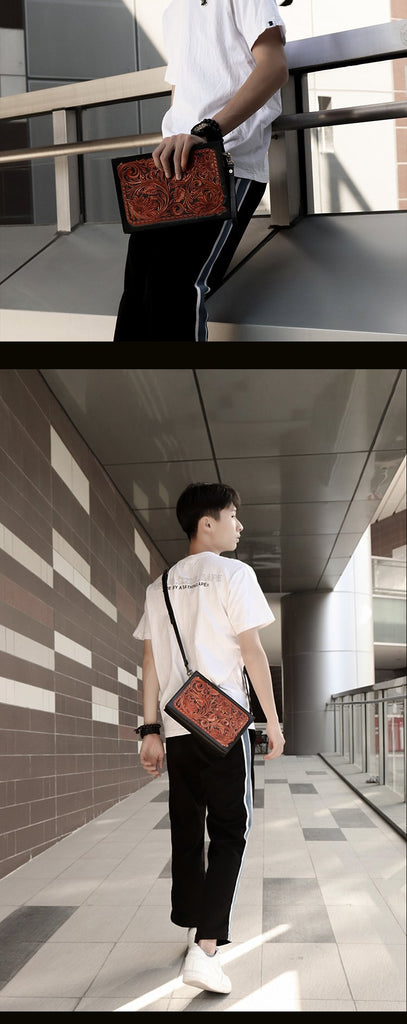 Style: Handmade Black Tooled Floral Leather Messenger Bags Side Bag Clutch Wristlet Bag For Men