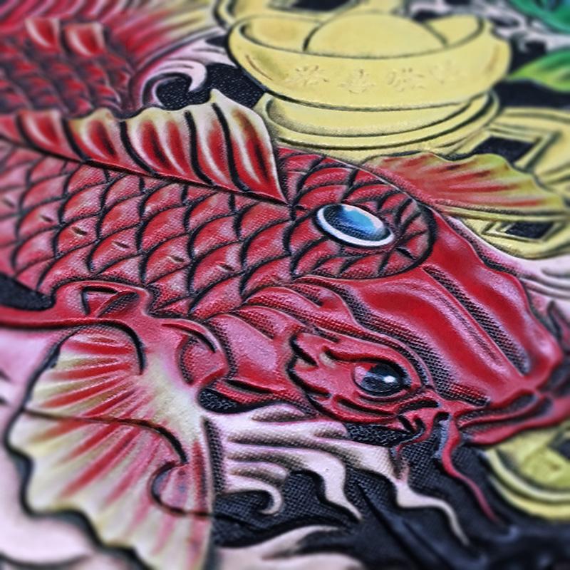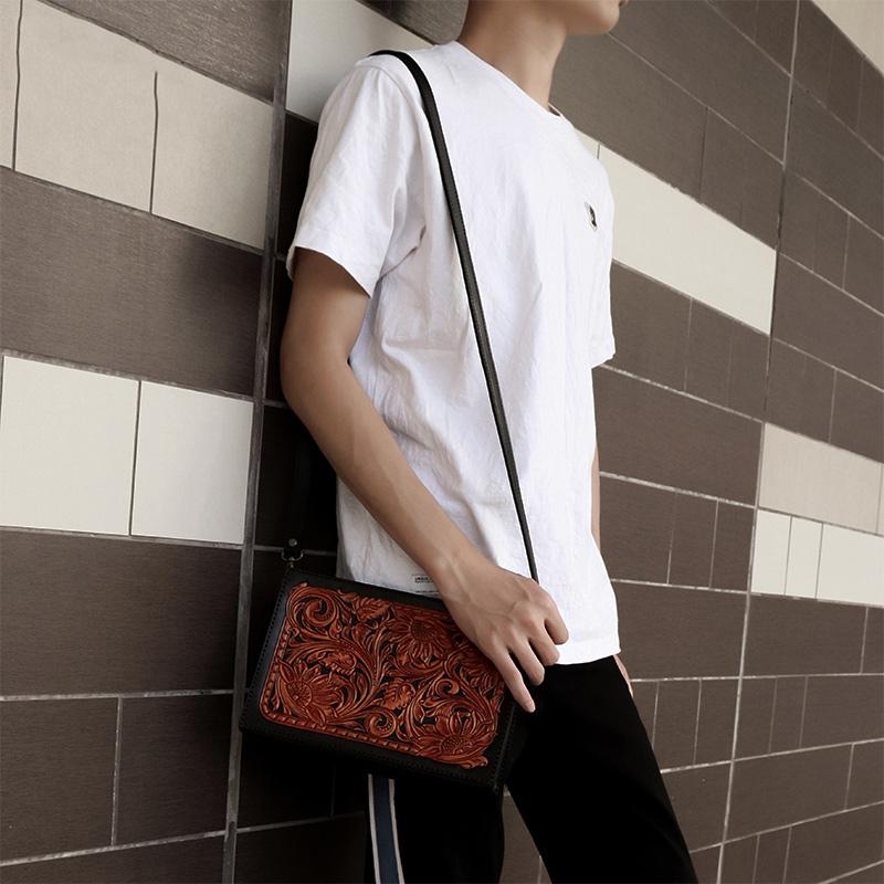 Style: Handmade Black Tooled Double Carp Leather Messenger Bags Side Bag Clutch Wristlet Bag For Men