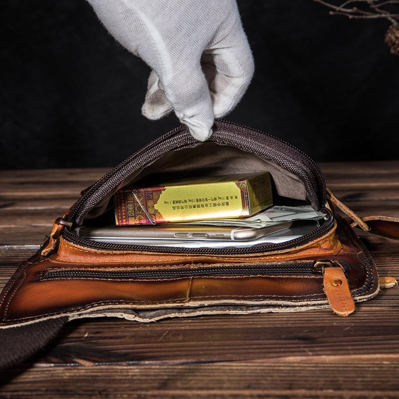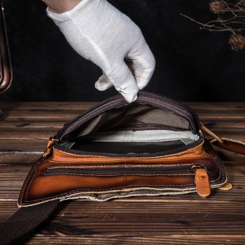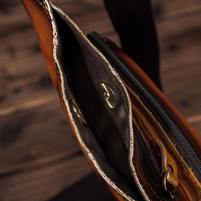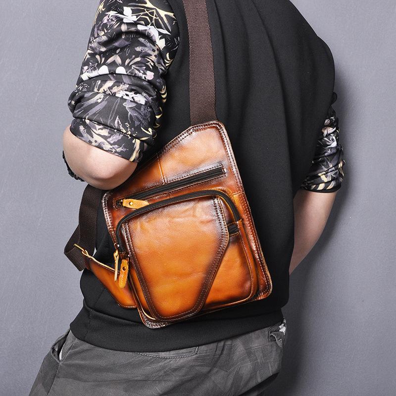Design: Badass Leather Sling Bag Men's Small Sling Pack Tan Sling Backpack Small Courier Bag For Men