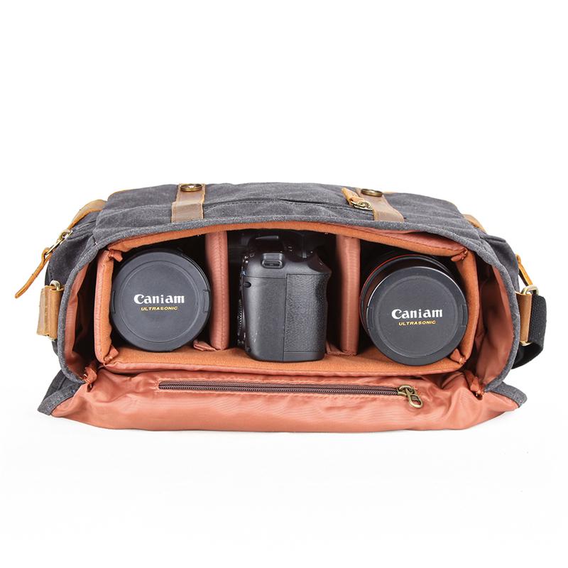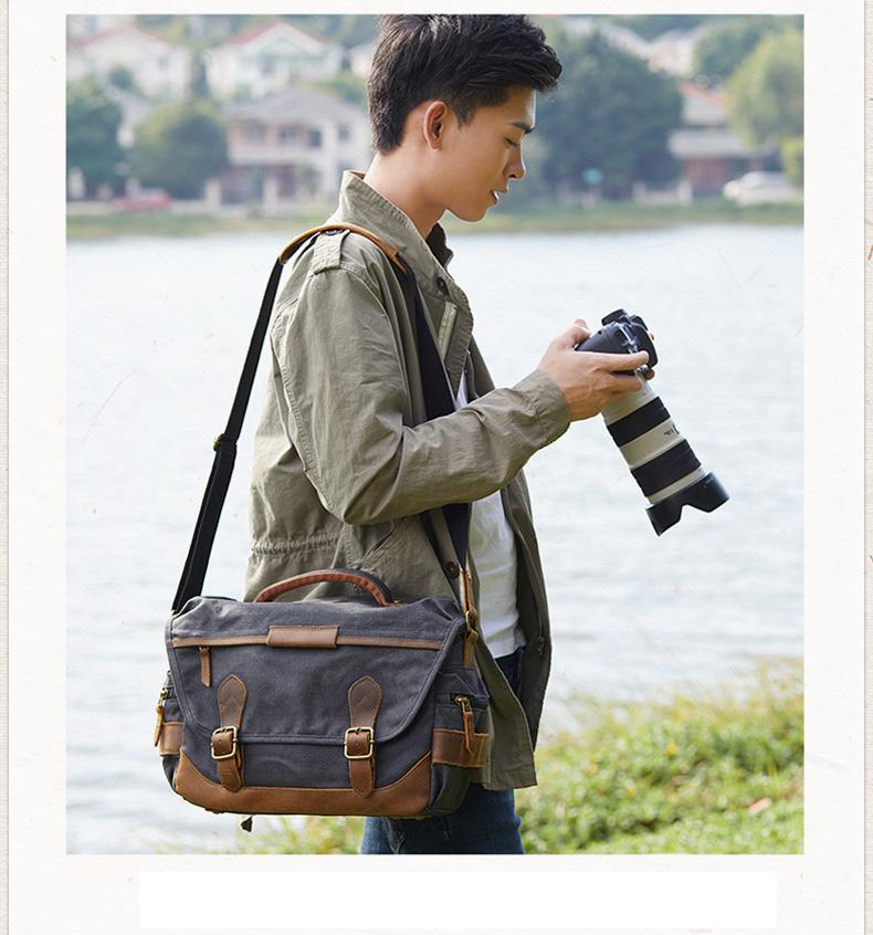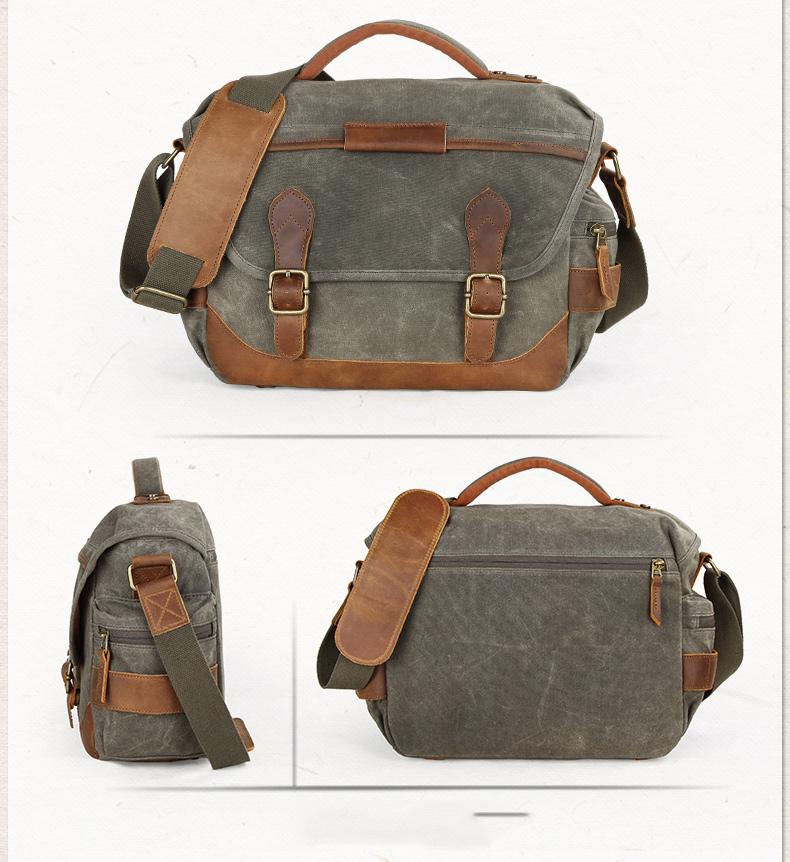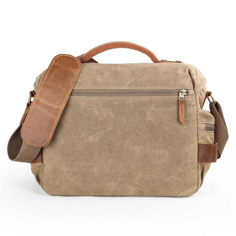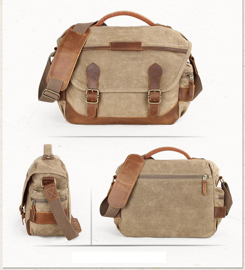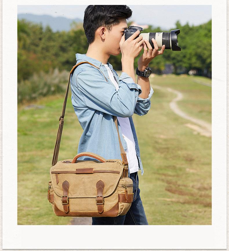 Design: Canvas Leather Mens Waterproof Khaki Camera Bag Shoulder Bag Army Green Diagonal Bag for Men
