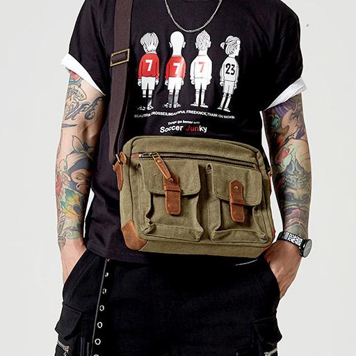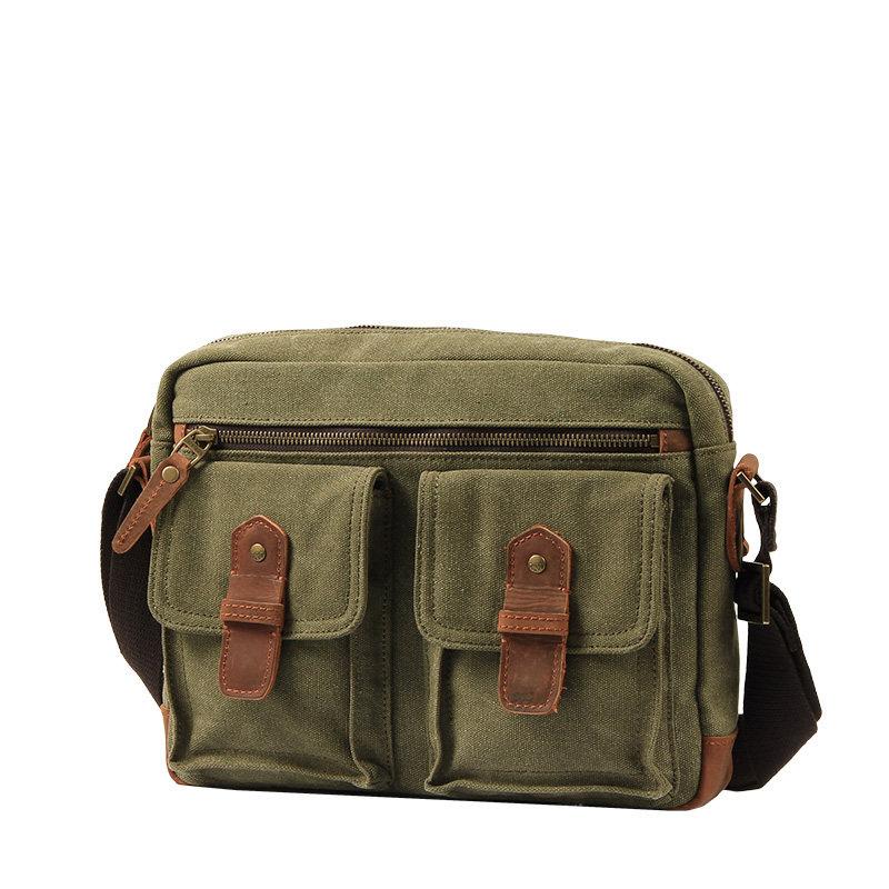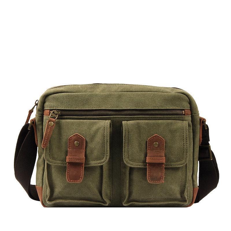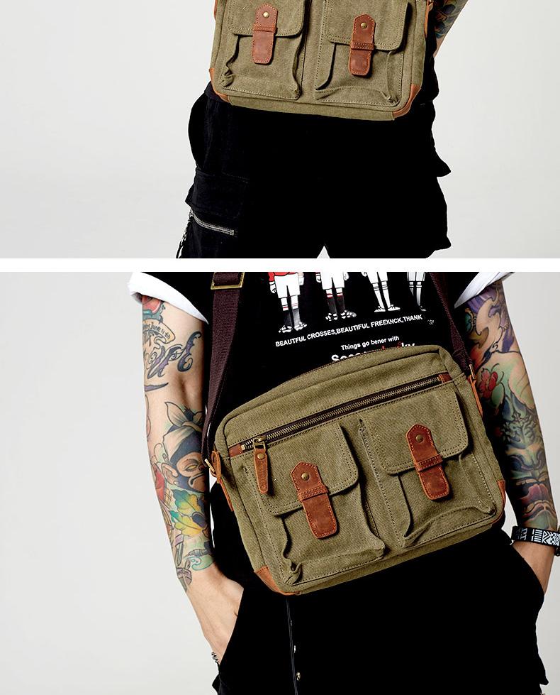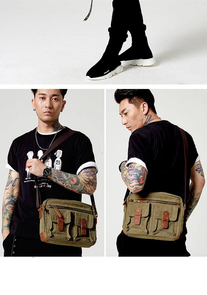 Style: Fashion Canvas Leather Mens Khaki Side Bag Messenger Bags Army Green Canvas Courier Bag for Men