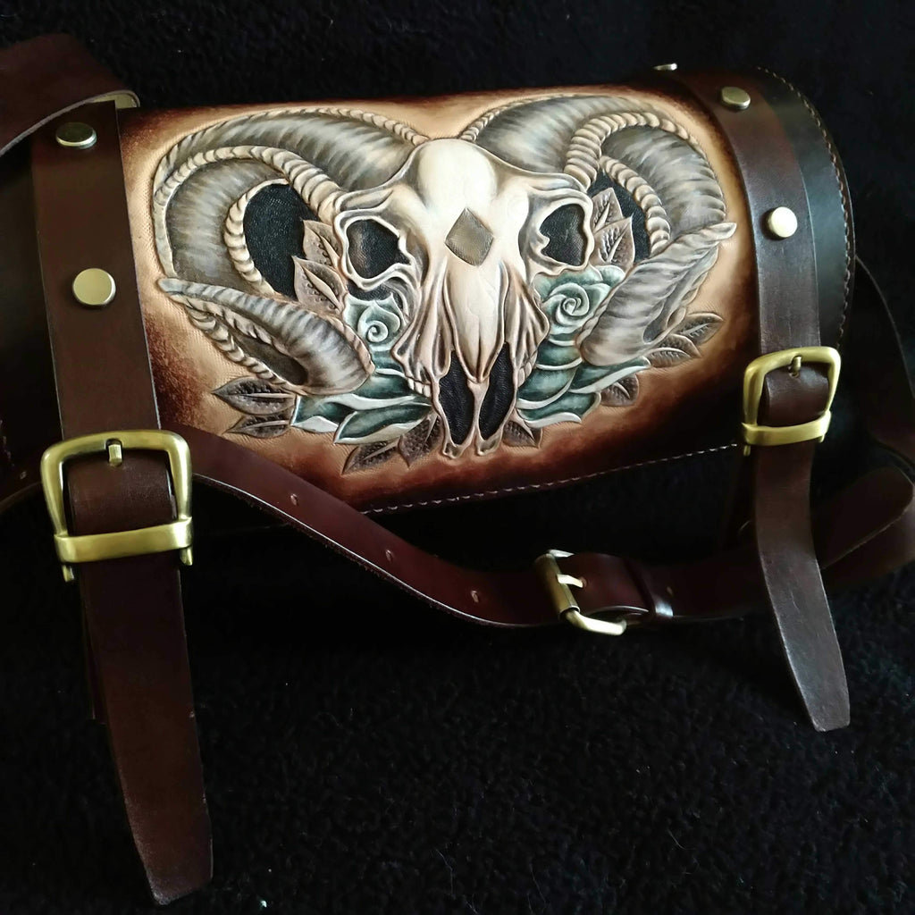 Design: Cool Handmade RAM Skull Tooled Leather Mens Biker Saddle Bag Biker Barrel Side Bag Messenger Bag For Men