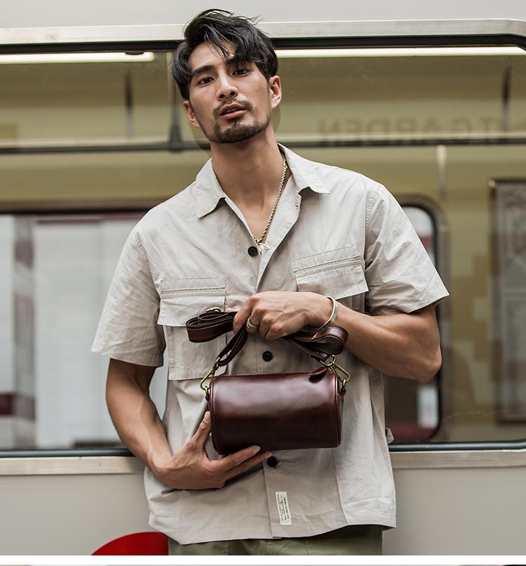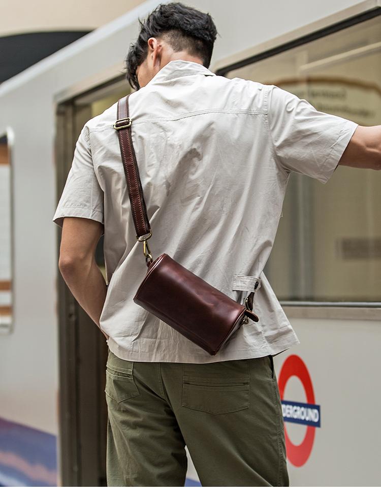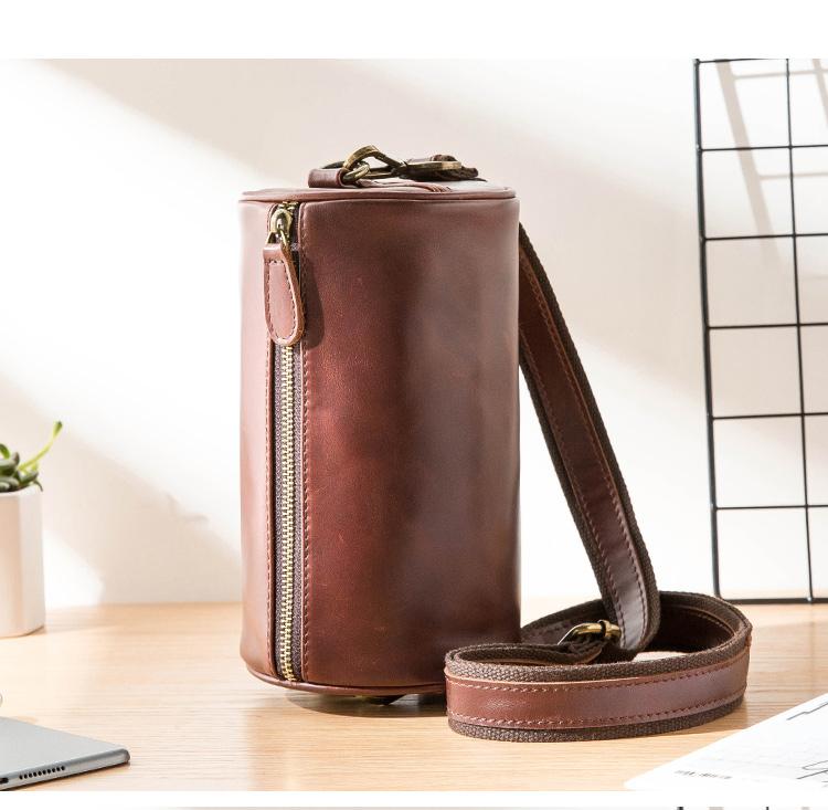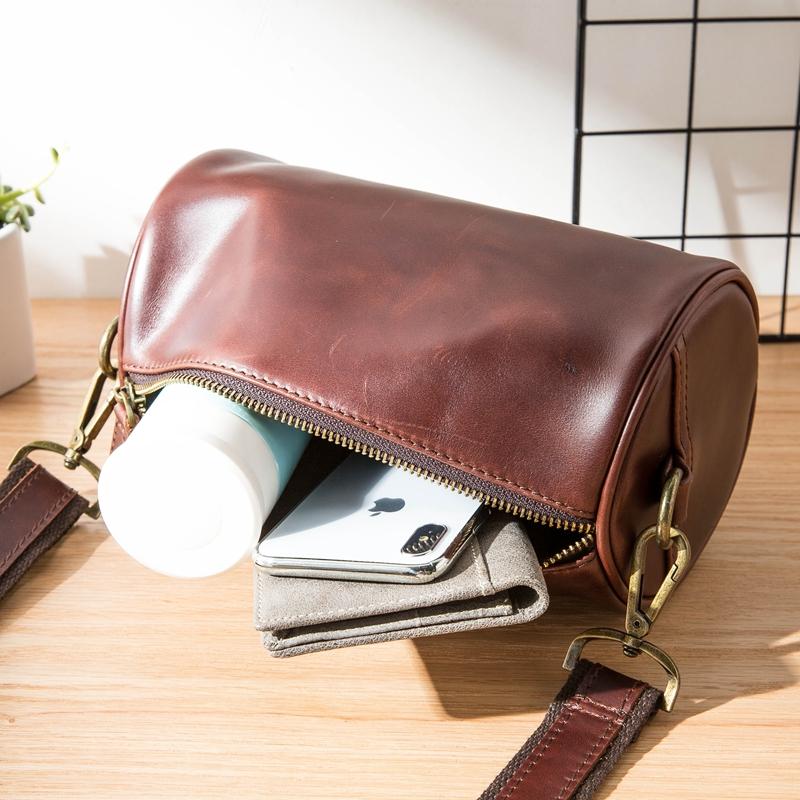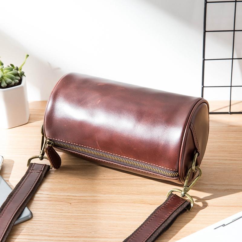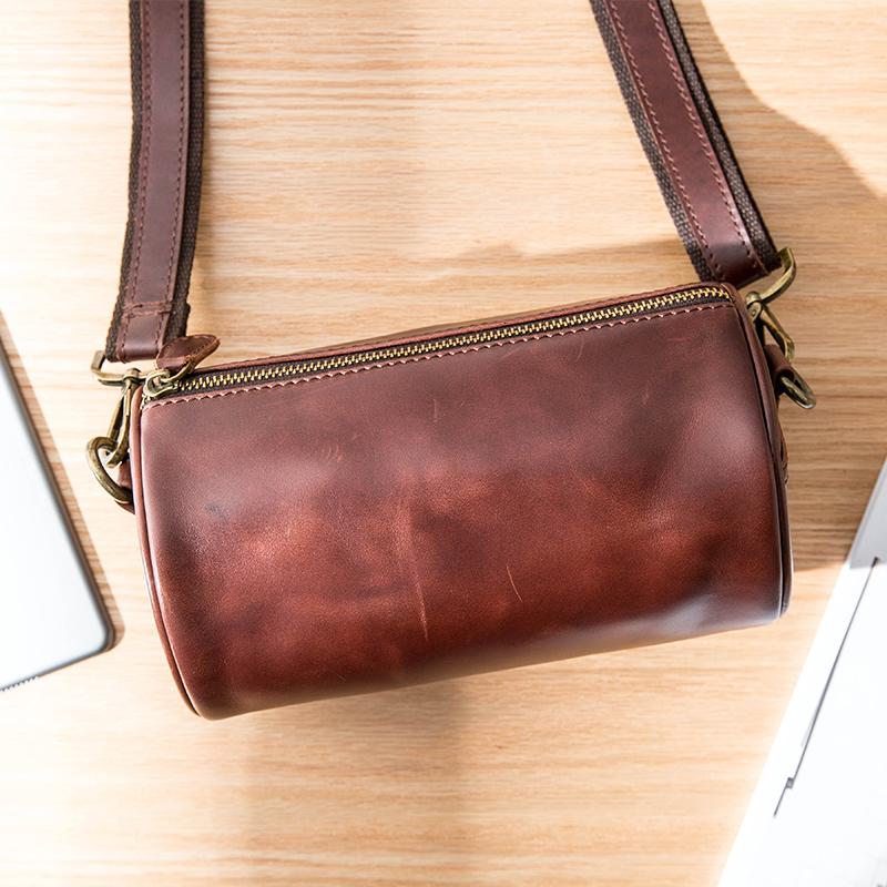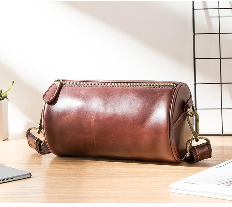 Red Brown Cool Leather Mens 8 inches Barrel Side Bag Bucket Messenger Bags Courier Bag for Men