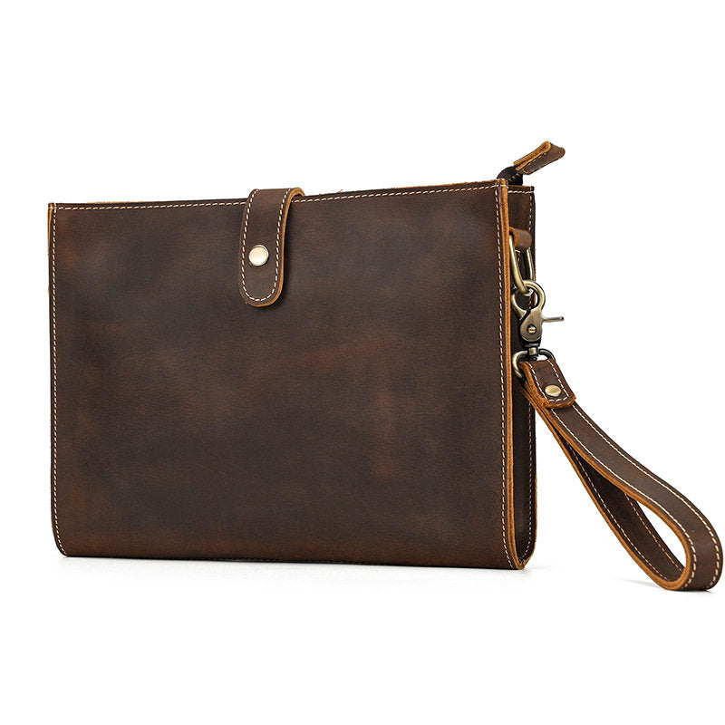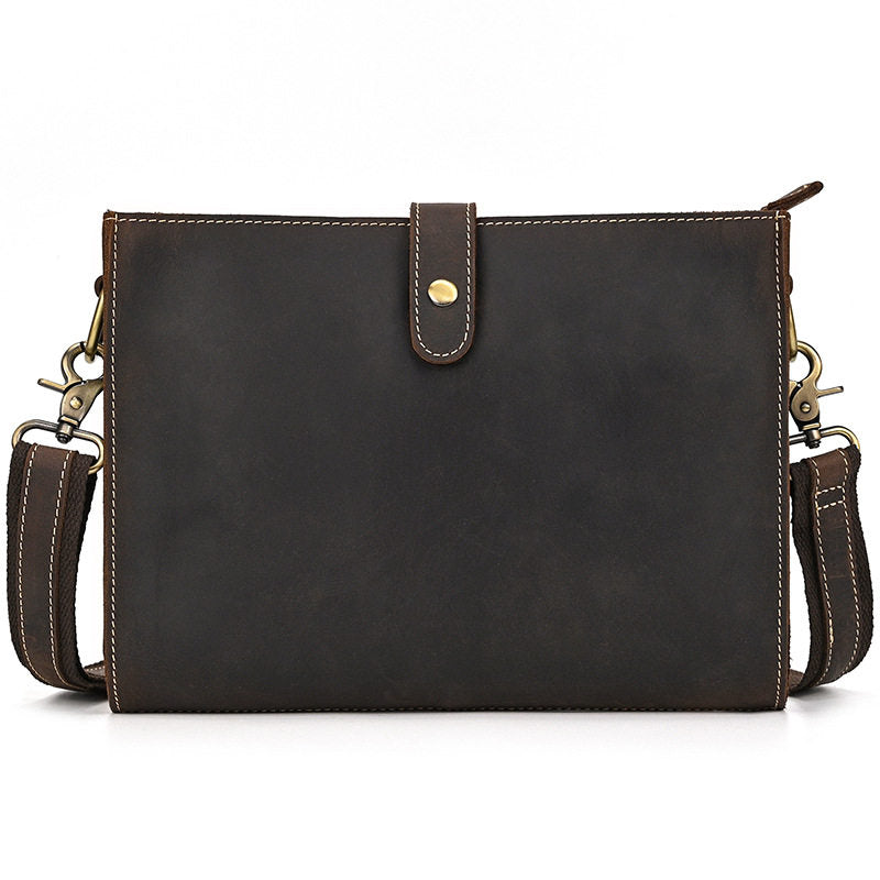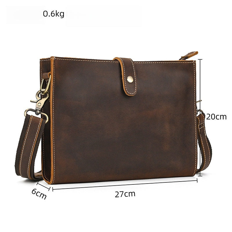 Introducing a masterclass in versatility and style with our Wristlet with Shoulder Strap, a thoughtfully designed accessory that adapts to your every need. Expertly crafted from premium full-grain crazy horse leather, this refined Clutch with Shoulder Strap measures 27cm x 20cm x 6cm, offering the perfect balance of spaciousness and portability. Available in two timeless shades—Classic Brown and Dark Brown—this bag stands out with its unique convertible design: it includes two detachable straps, allowing you to wear it as a classic clutch, a chic shoulder bag, a comfortable crossbody, or a convenient wristlet. The combination of a durable leather wrist loop and an adjustable shoulder strap provides unmatched flexibility for daily wear, work, and travel.