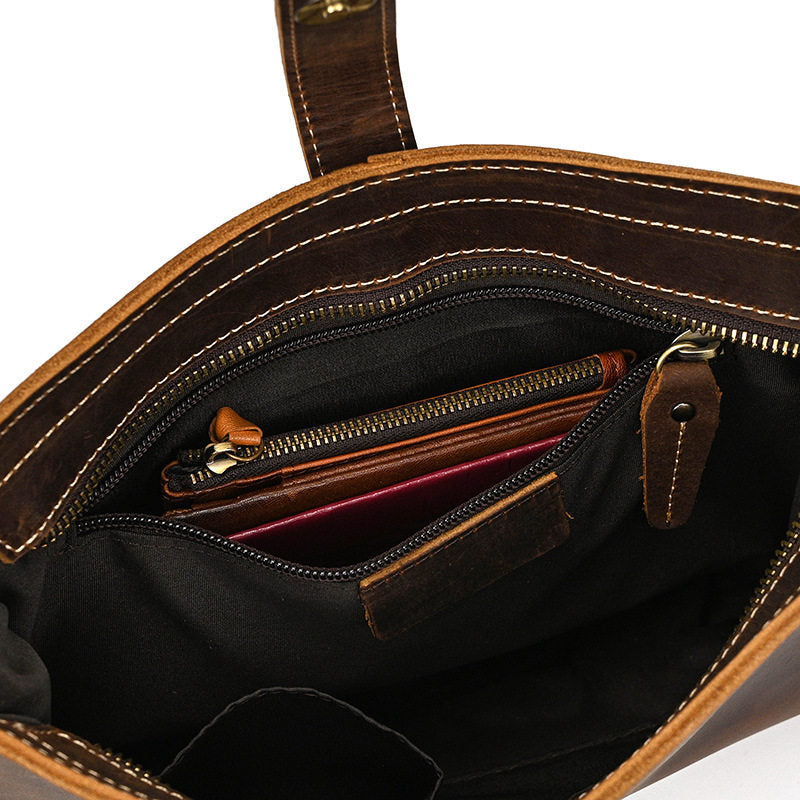 • Main Compartment: Zippered with a leather buckle closure for added security
