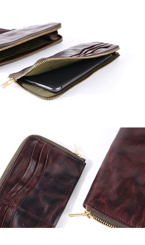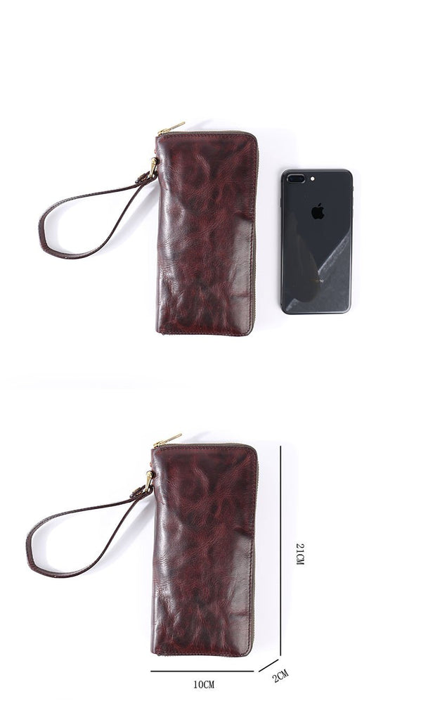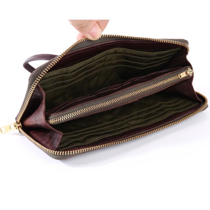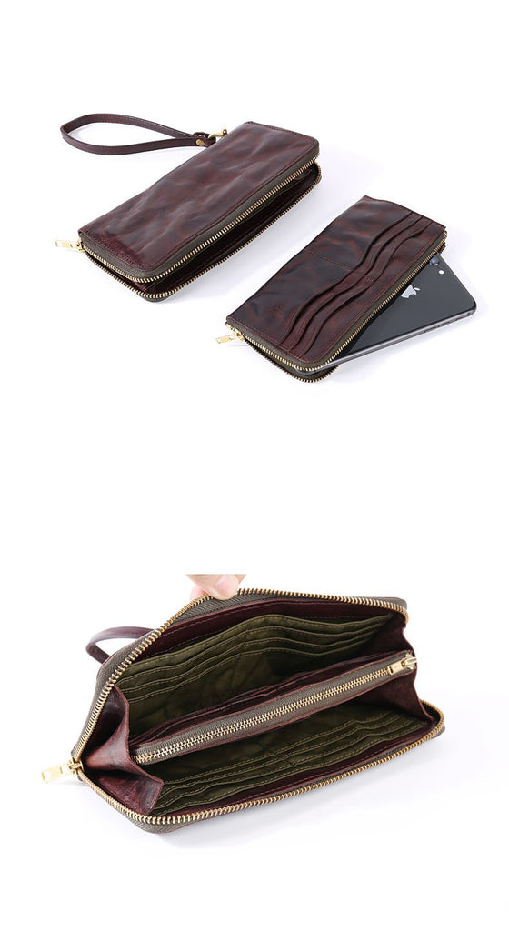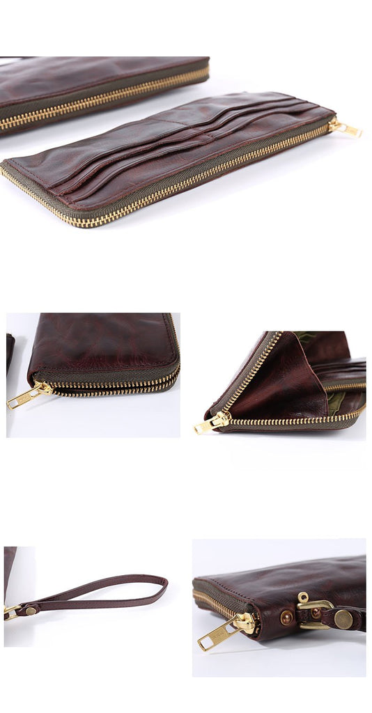 Design: Genuine Leather Mens Clutch Simple Brown Wallet Zipper Clutch Wristlet Phone Bagfor Men