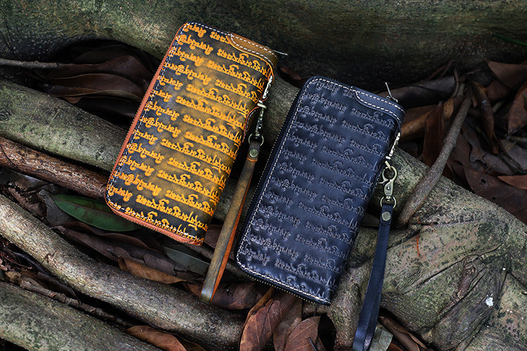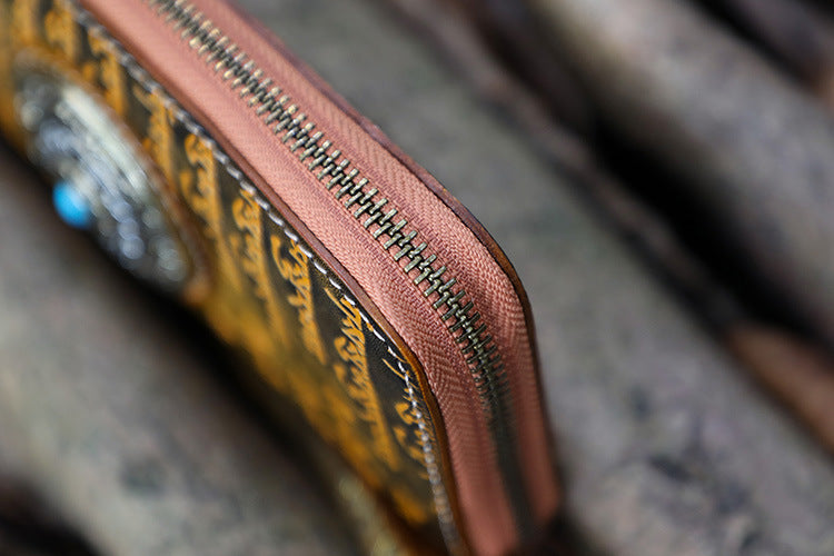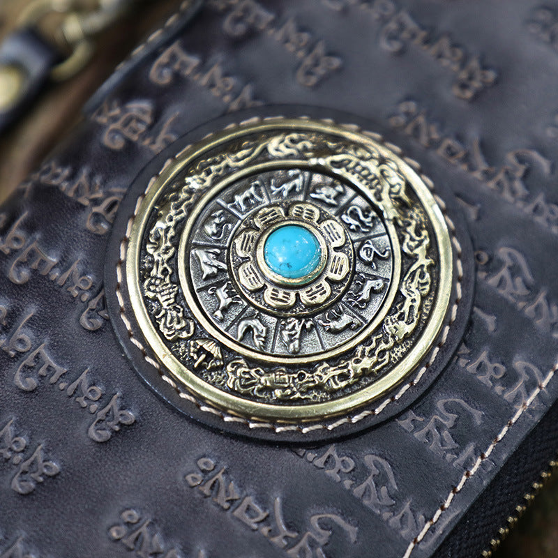 Design: Handmade Leather Tibetan Scriptures Long Wallet Cool Zipper Clutch Wristlet Wallet for Men