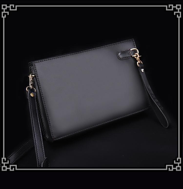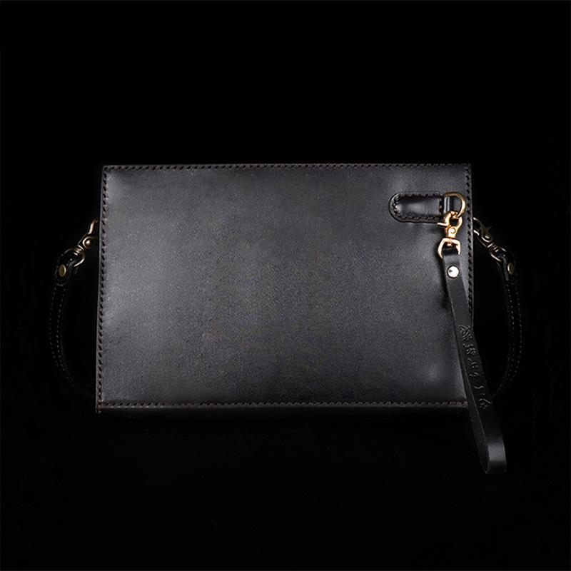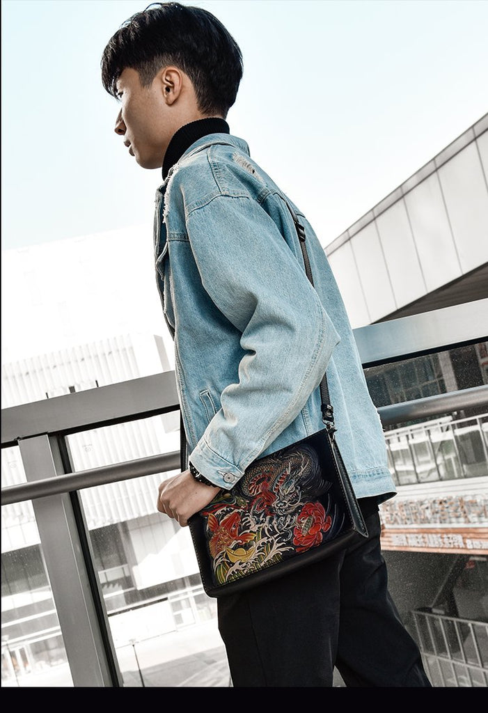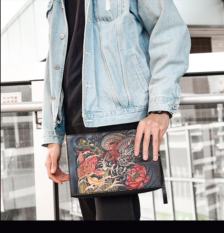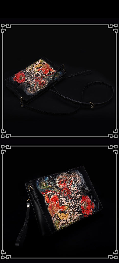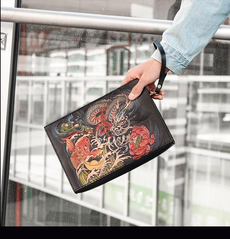 Style: Handmade Black Tooled Dragon Carp Leather Messenger Bag Side Bag Clutch Wristlet Bag For Men