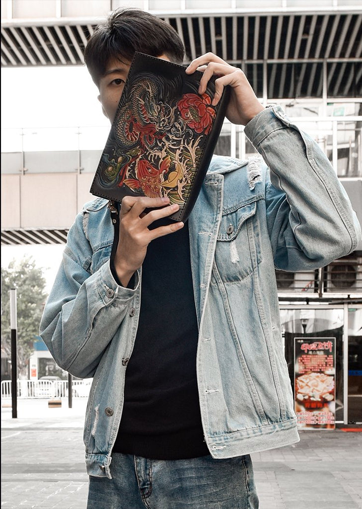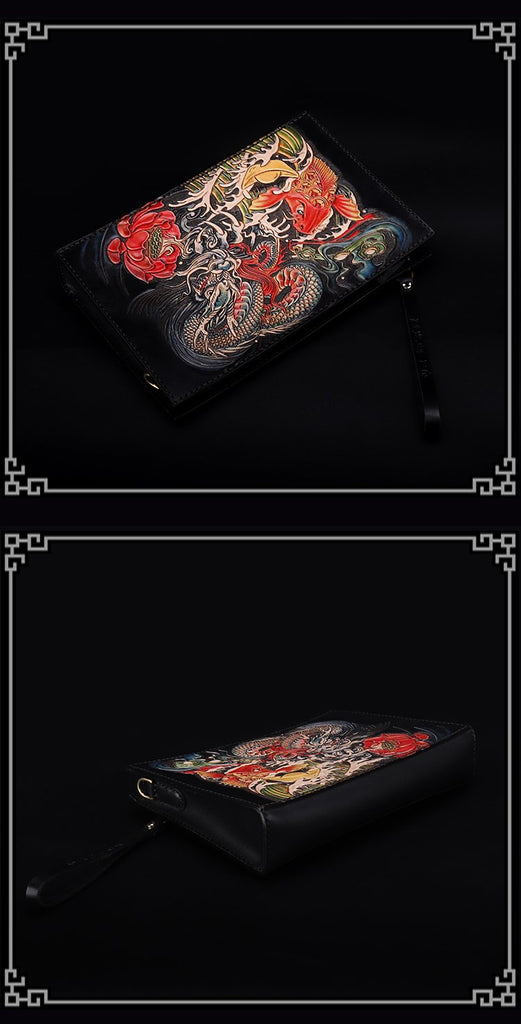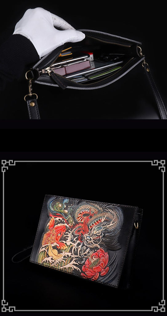 Design: Handmade Black Tooled Dragon Carp Leather Messenger Bag Side Bag Clutch Wristlet Bag For Men