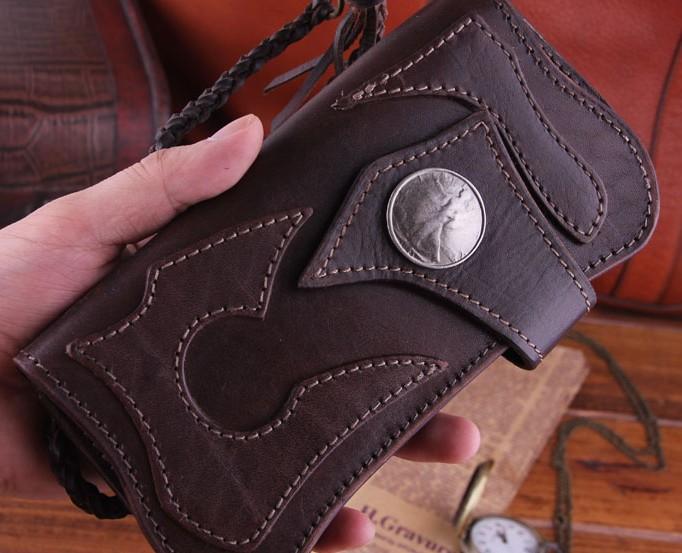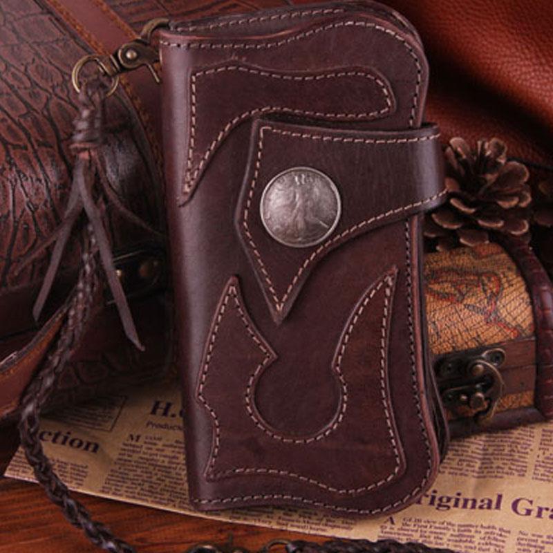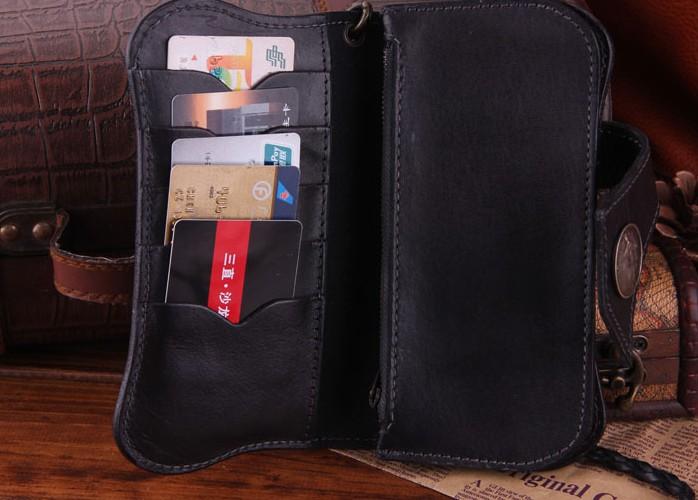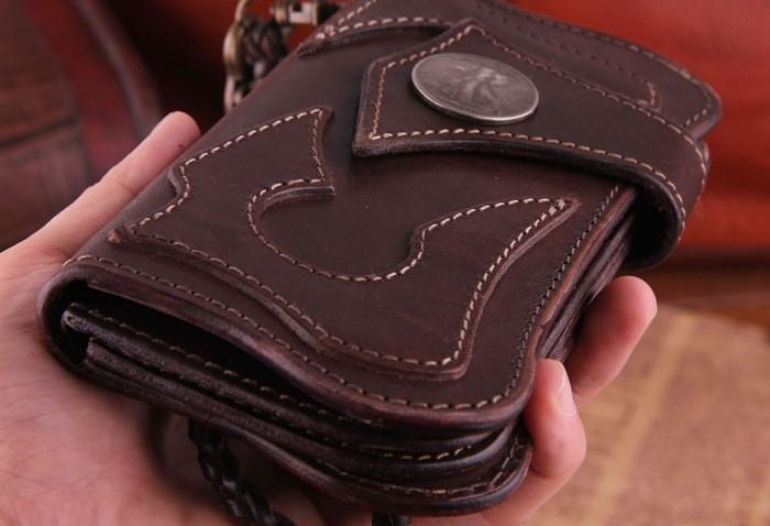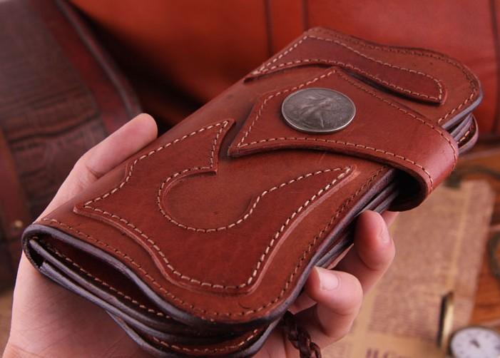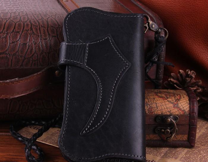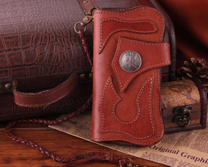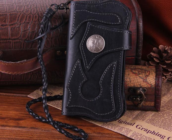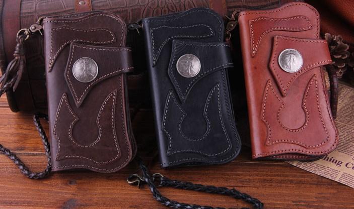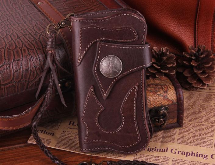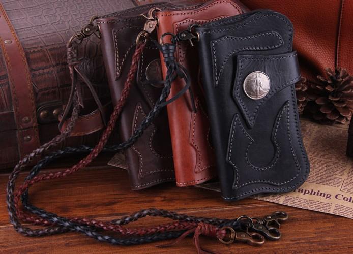 Design: Handmade Genuine Leather Mens Cool Biker Chain Wallet Long Leather Wallet Slim Clutch Wristlet Wallet for Men