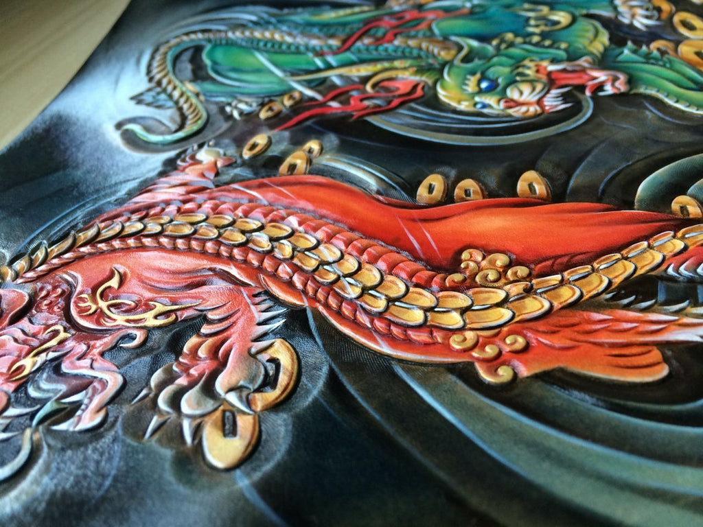 Design: Handmade Leather Mens Clutch Cool Tooled Chinese Monster Wallet Zipper Clutch Wristlet Wallet for Men