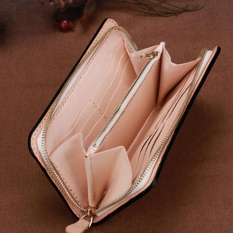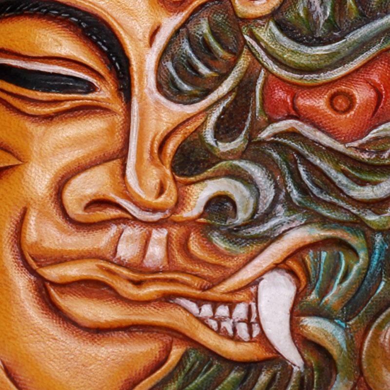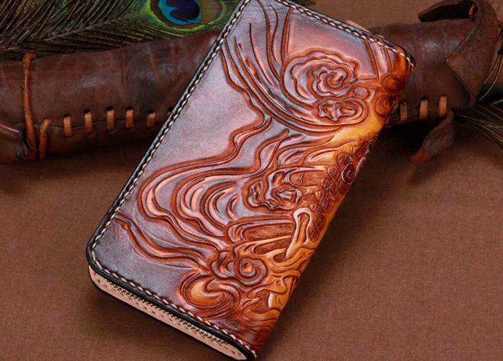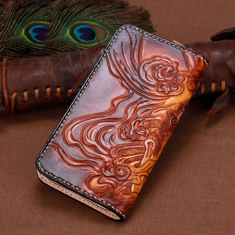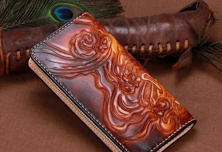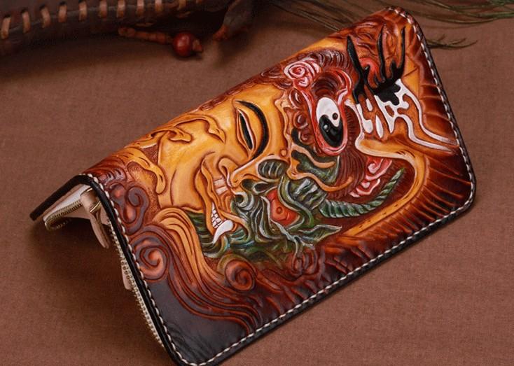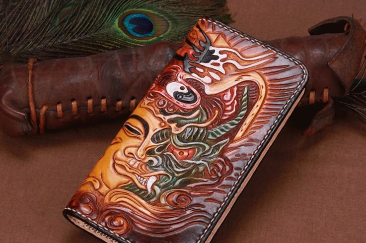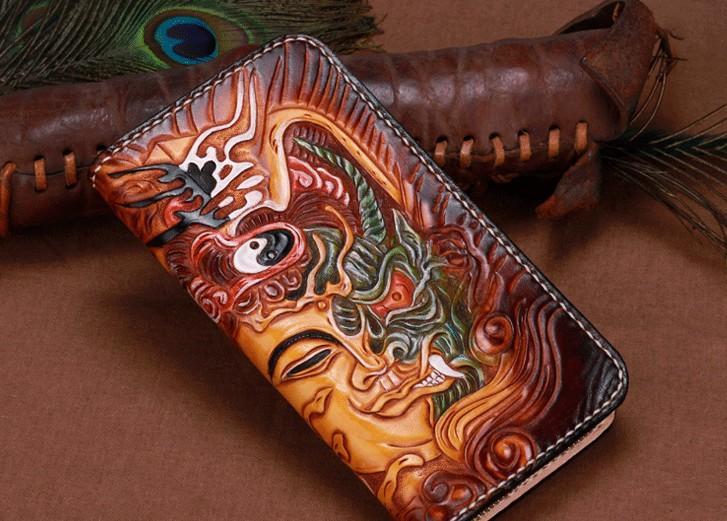 Design: Handmade Leather Mens Clutch Wallet Cool Buddha&Demon Tooled Wallet Long Zipper Wallets for Men