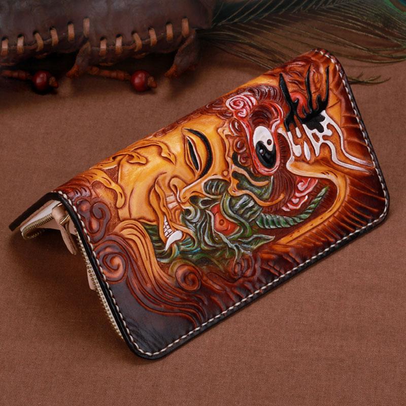 Handmade Leather Mens Clutch Wallet Cool Buddha&Demon Tooled Wallet Long Zipper Wallets for Men