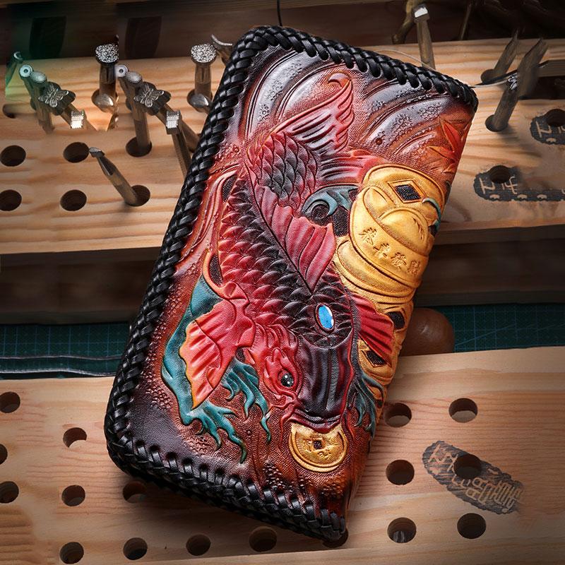 Design: Handmade Leather Mens Clutch Wallet Cool Carp Tooled Wallet Long Zipper Wallets for Men