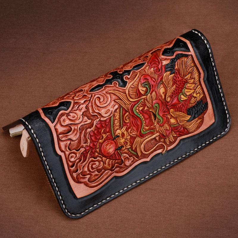 Style: Handmade Leather Mens Clutch Wallet Cool Kylin Tooled Wallet Long Zipper Wallets for Men