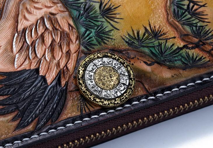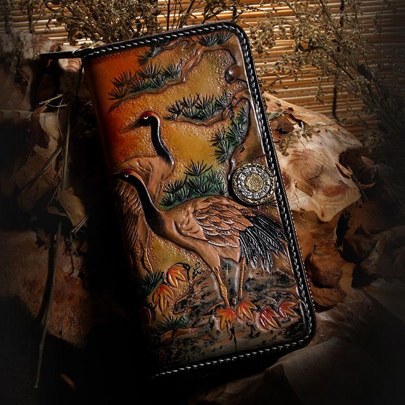 Style: Handmade Leather Mens Clutch Wallet Cool Red-Crowned Crane Tooled Wallet Long Zipper Wallets for Men