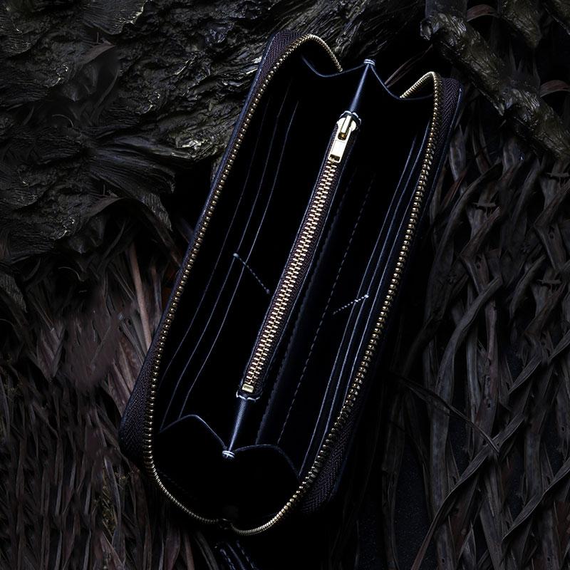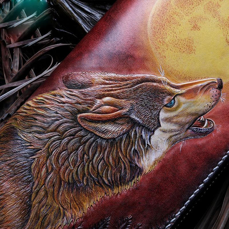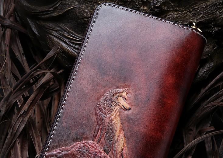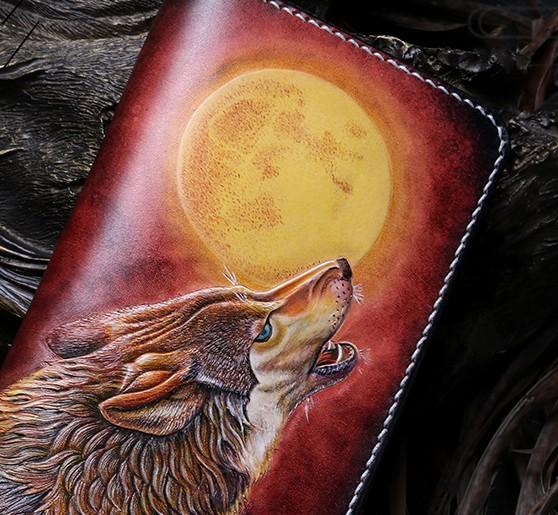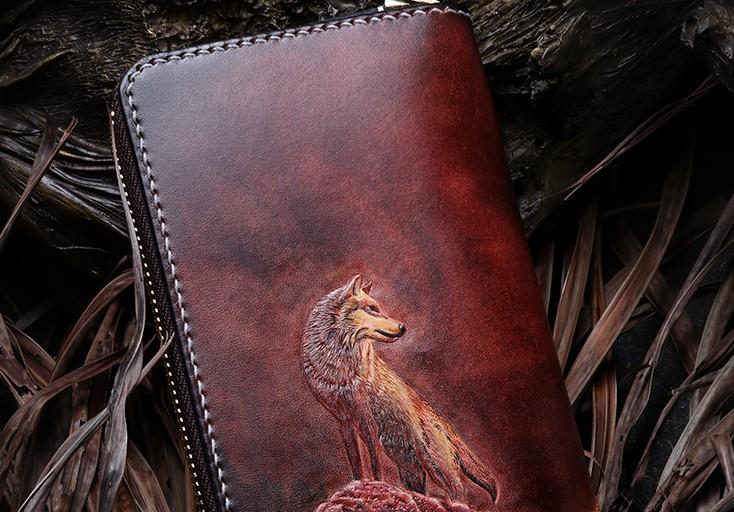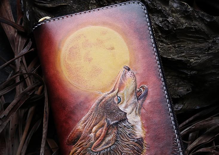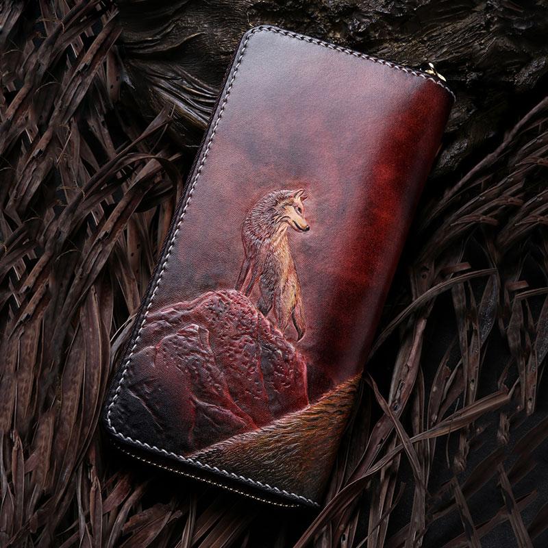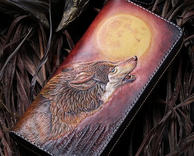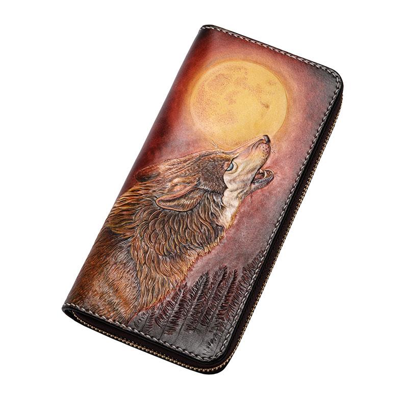 Handmade Leather Mens Clutch Wallet Cool Wolf Tooled Wallet Long Zipper Wallets for Men