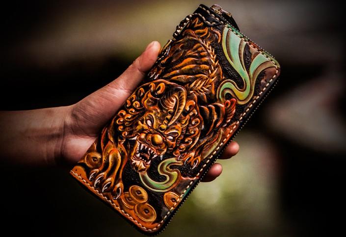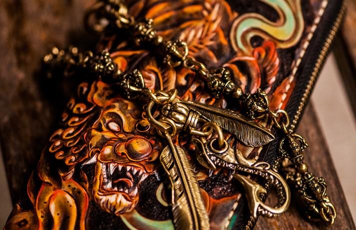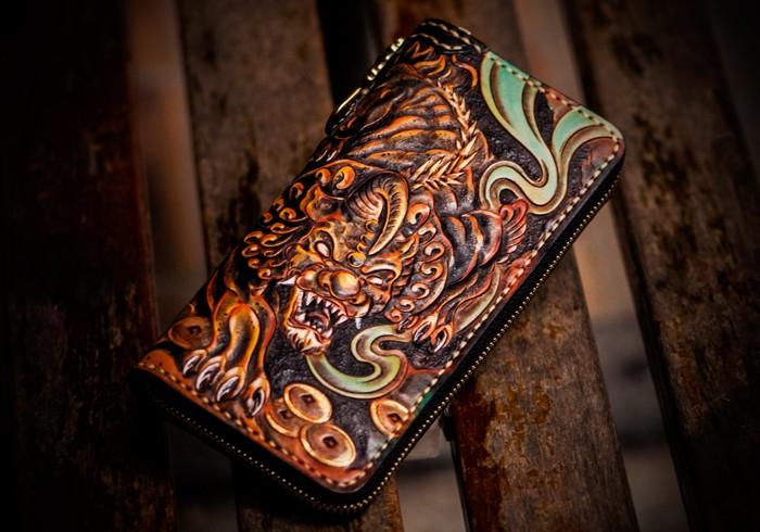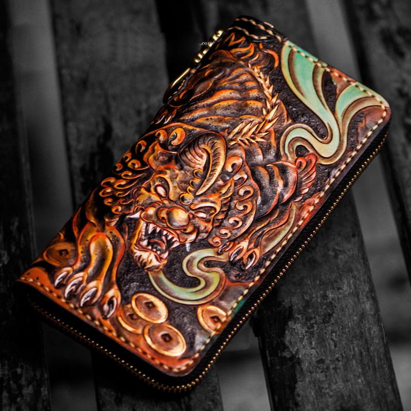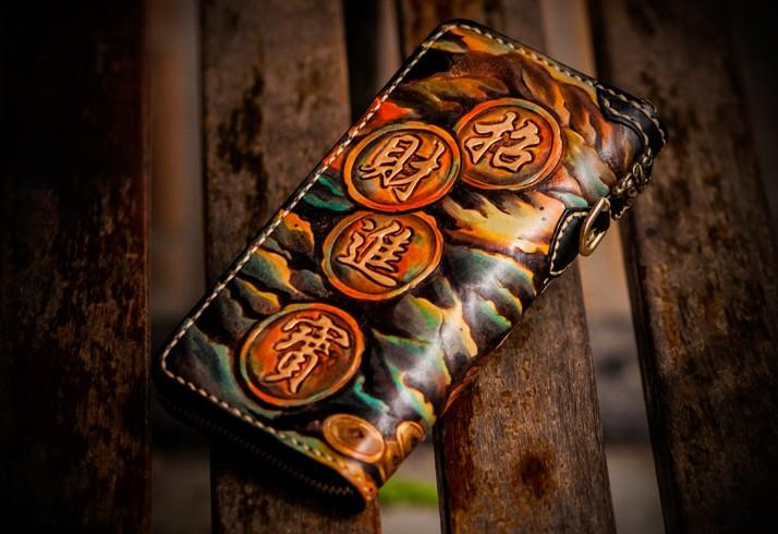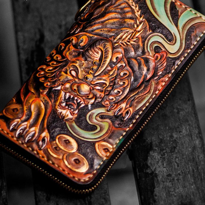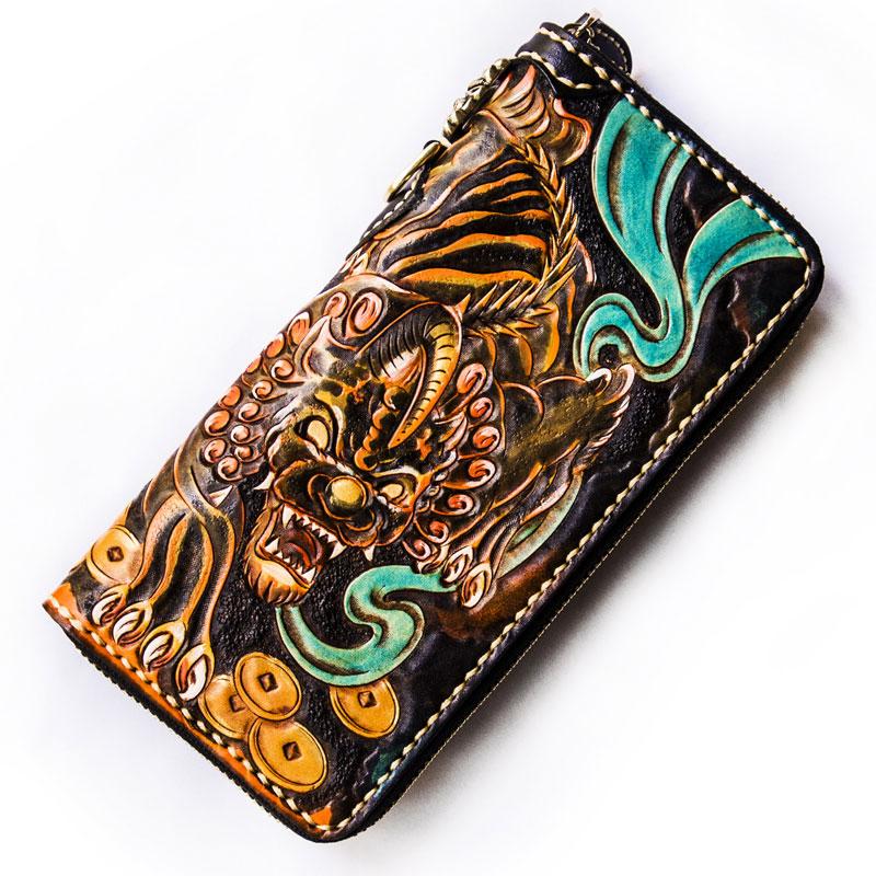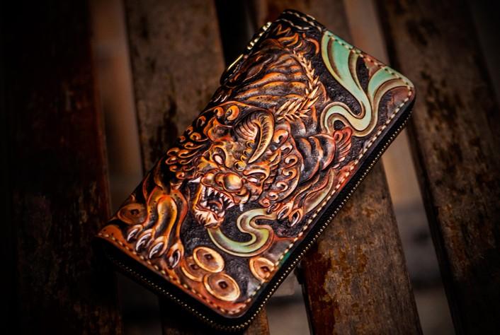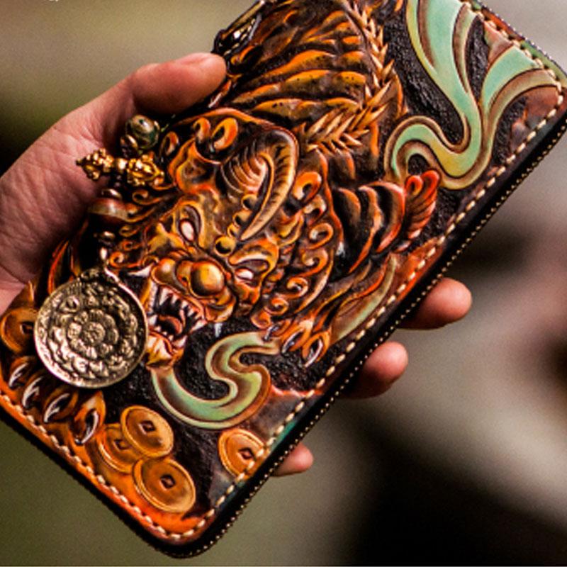 Design: Handmade Leather Mens Tooled Monster Chain Biker Wallet Cool Leather Wallet Long Clutch Wallets for Men