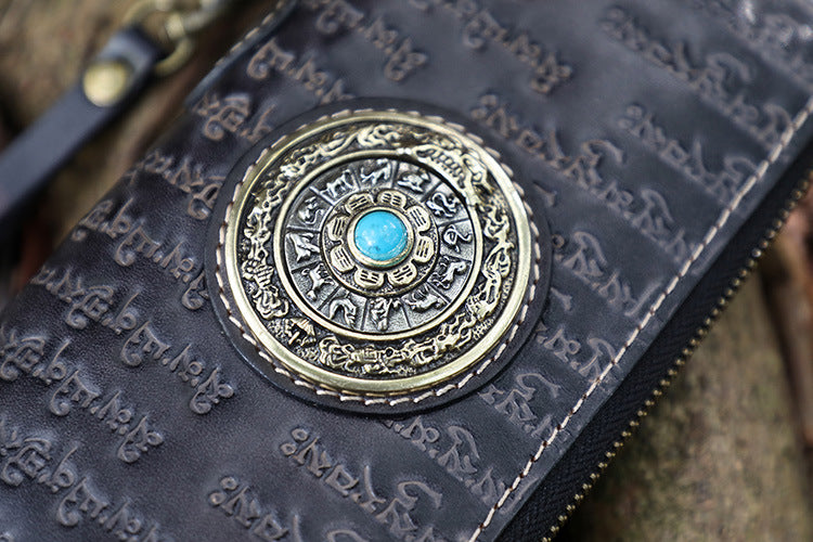 Design: Handmade Leather Tibetan Scriptures Long Wallet Cool Zipper Clutch Wristlet Wallet for Men