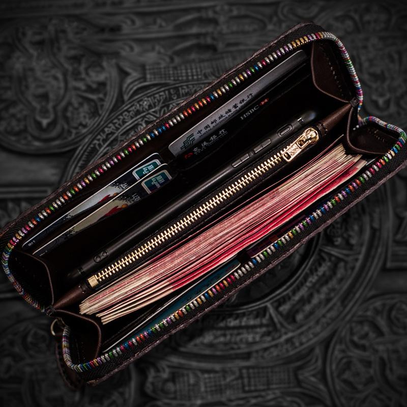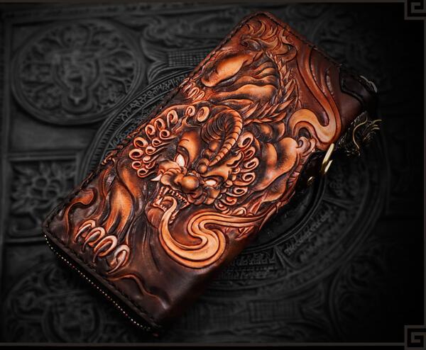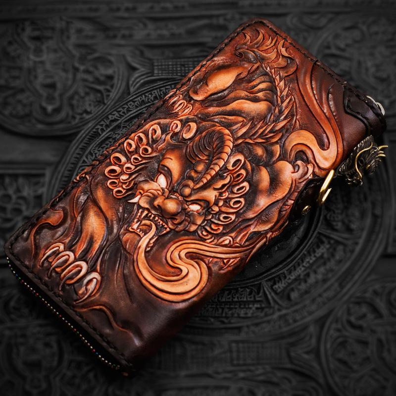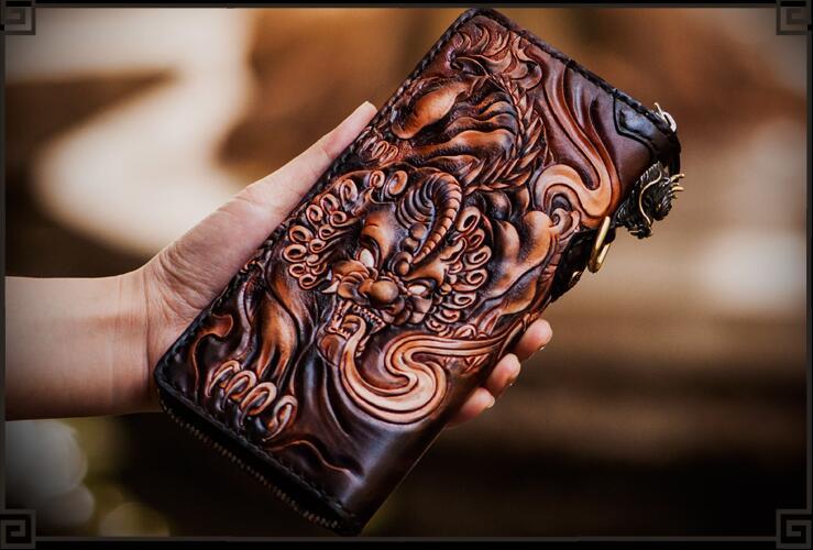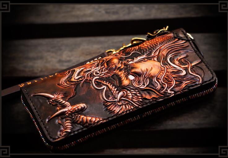 Design: Handmade Leather Tooled Chinese Dragon Mens Chain Biker Wallet Cool Leather Wallet Long Phone Wallets for Men