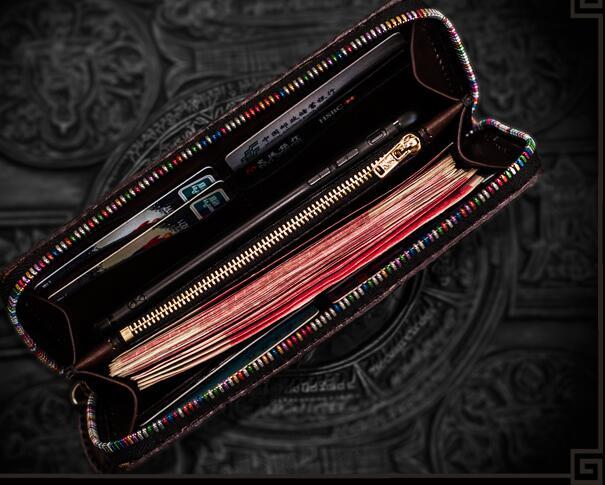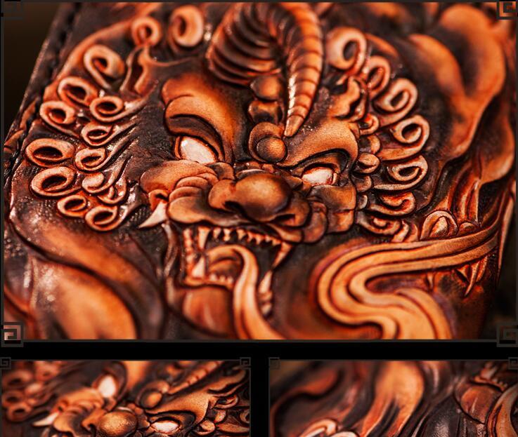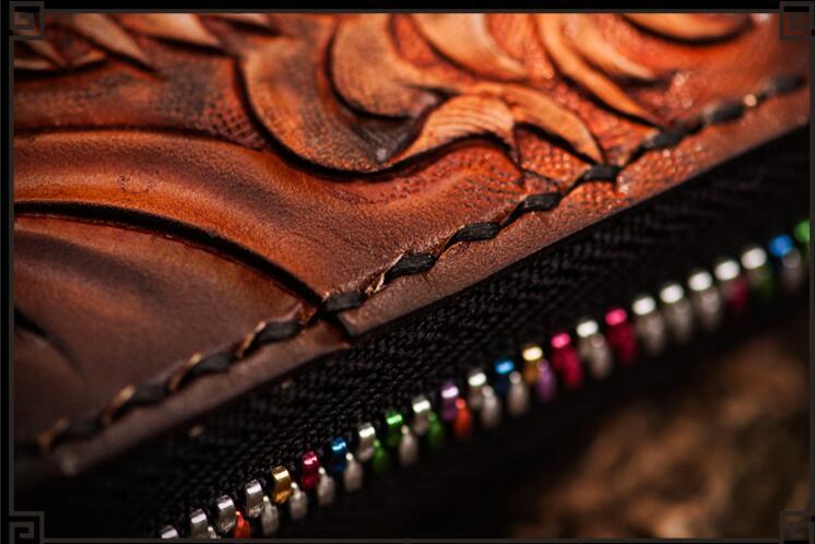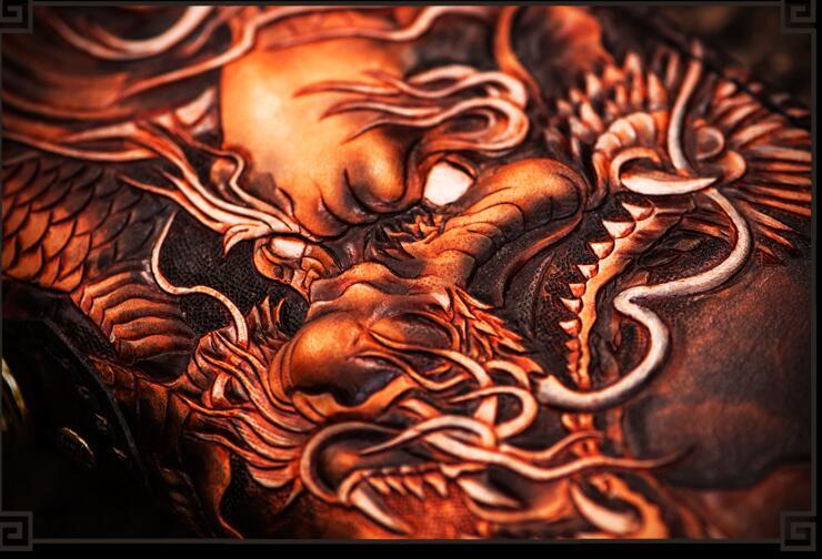 Handmade Leather Tooled Chinese Dragon Mens Chain Biker Wallet Cool Leather Wallet Long Phone Wallets for Men