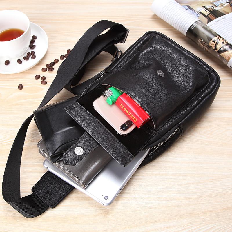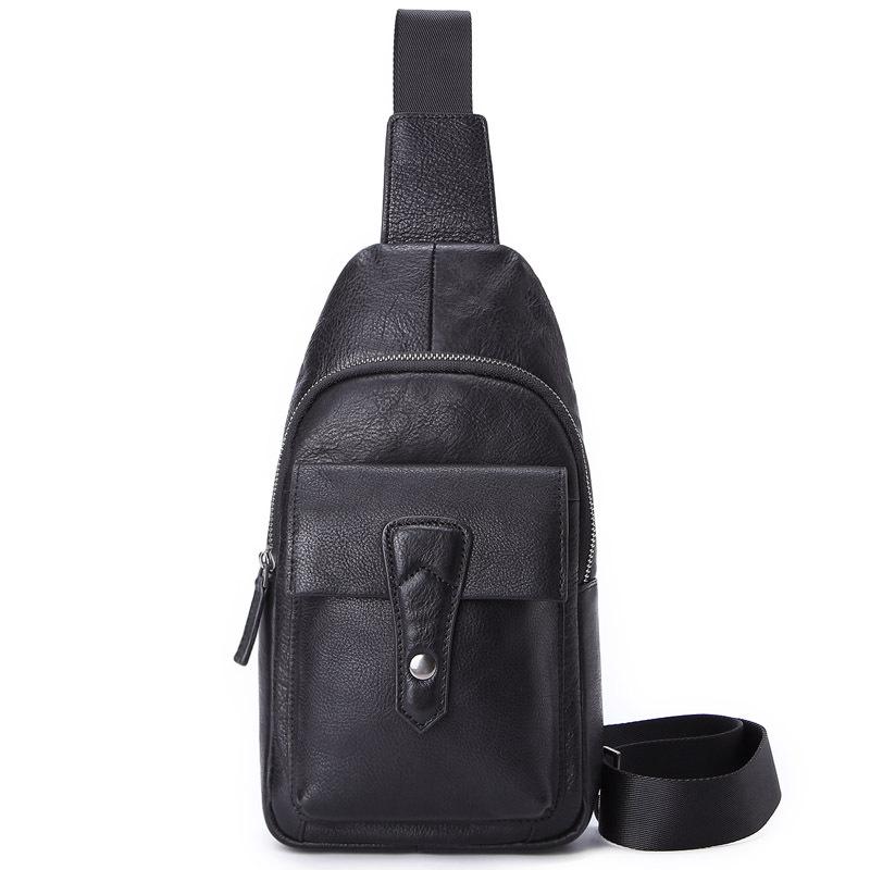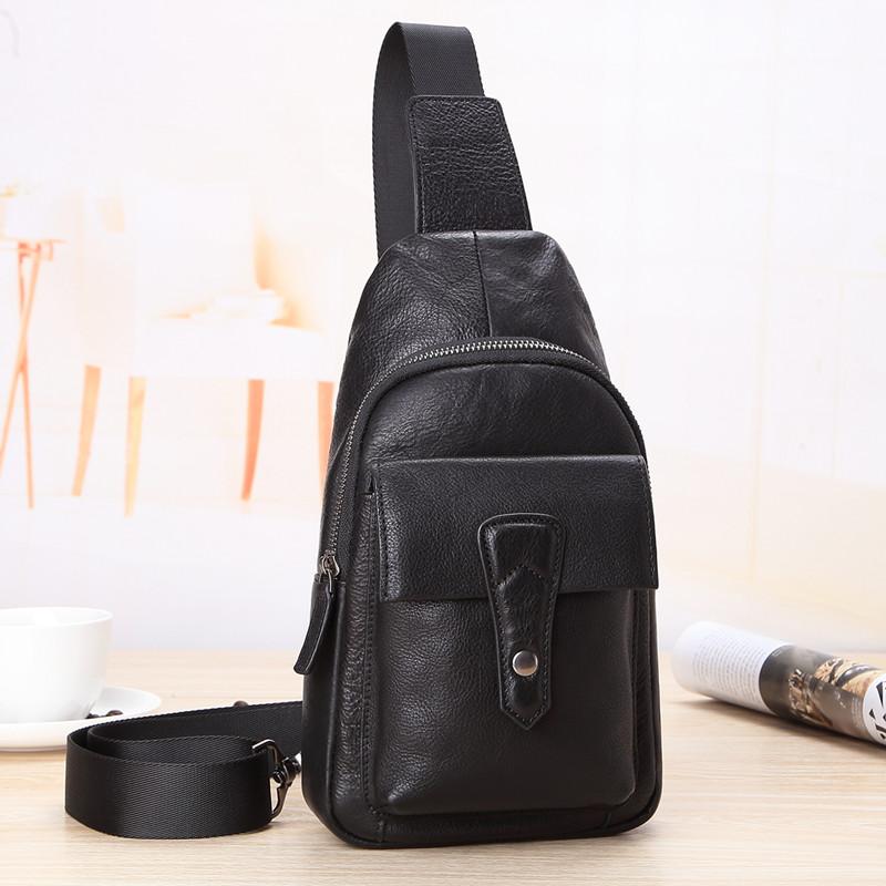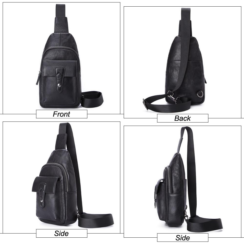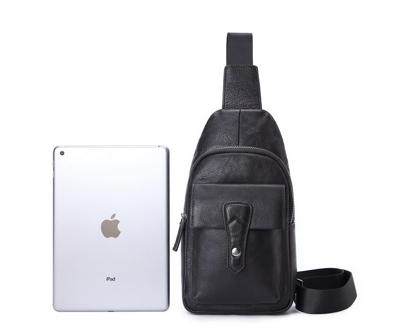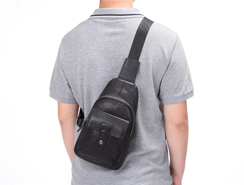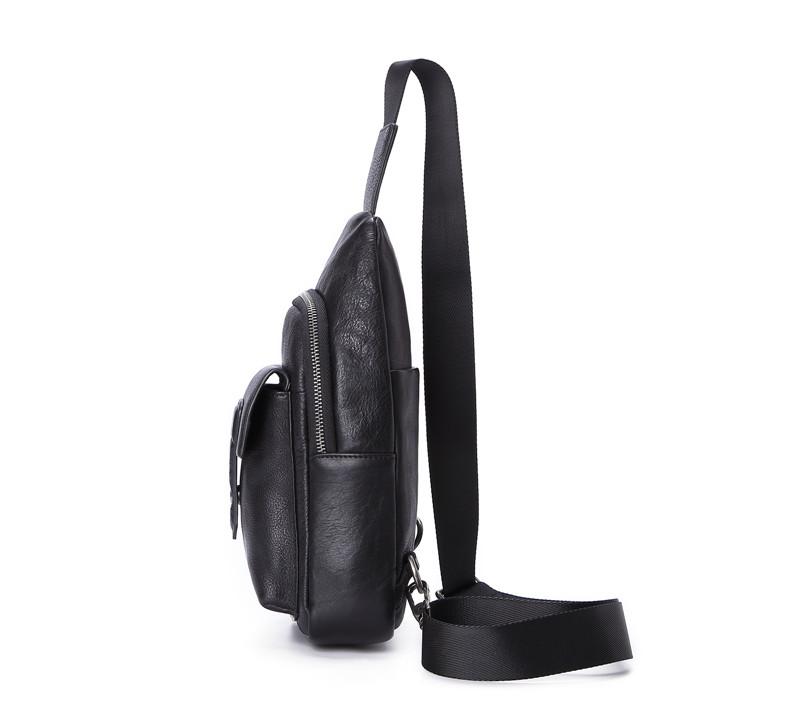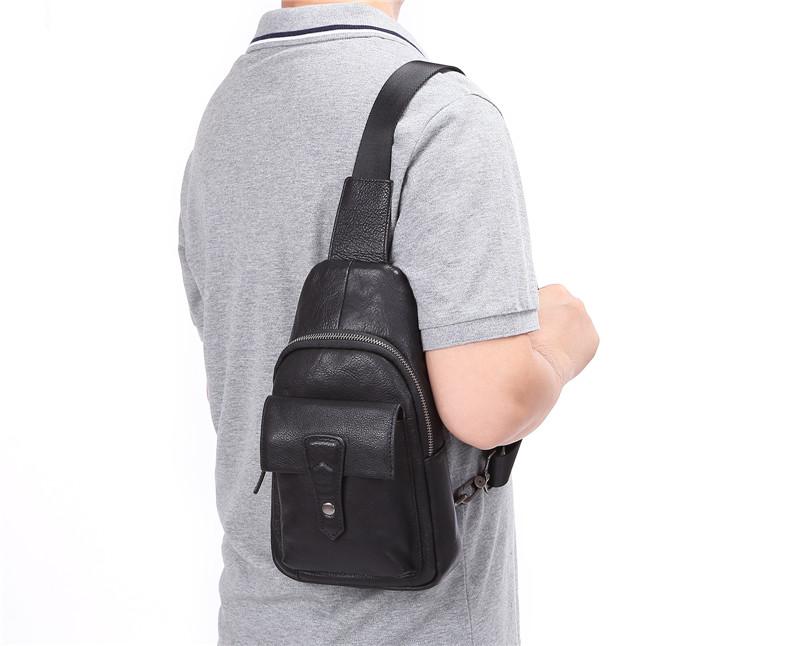 Black Mens Leather Sling Bag Chest Bag One shoulder Black Backpack Sports Bag For Men