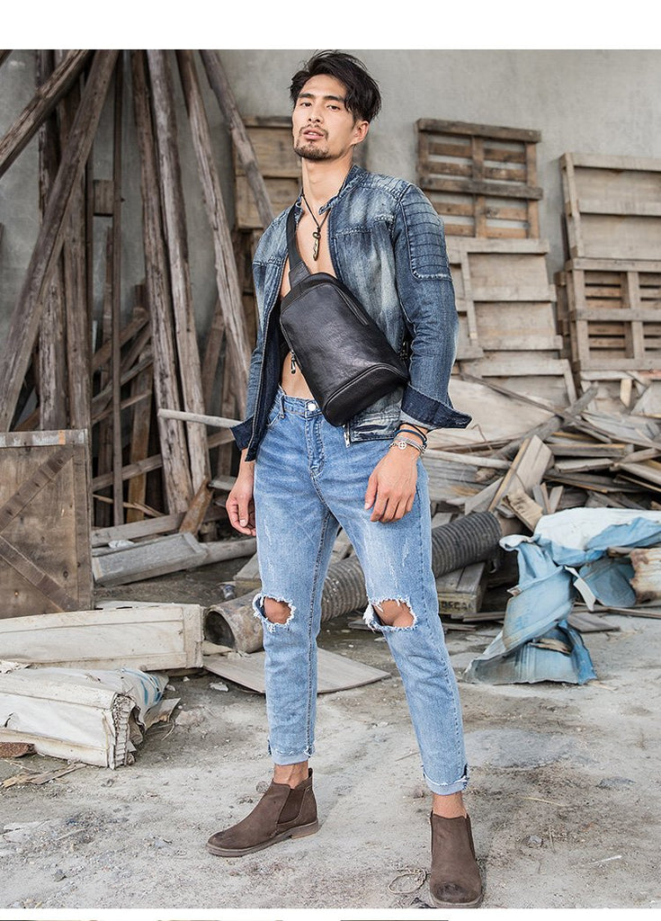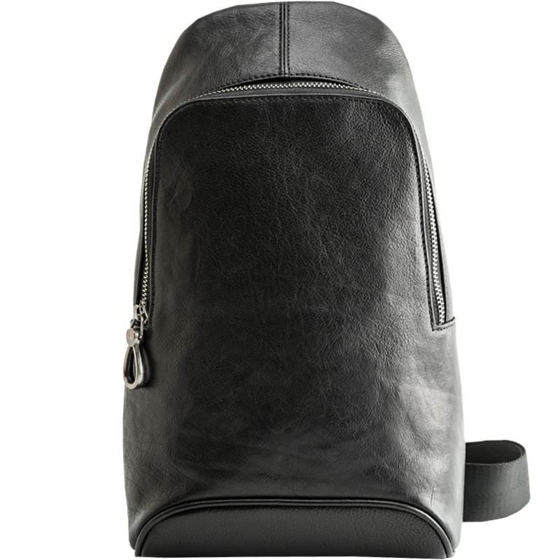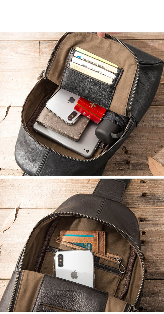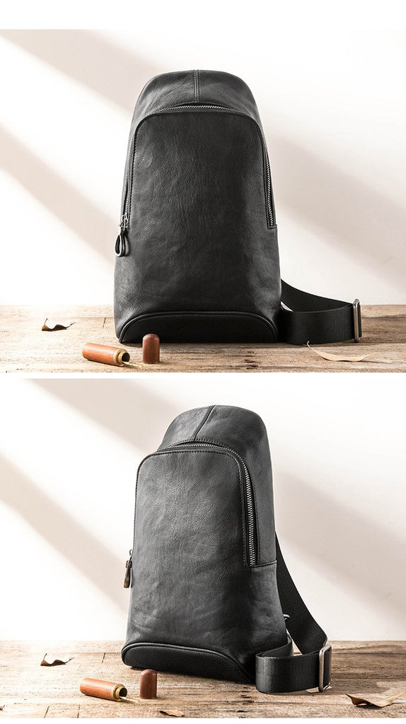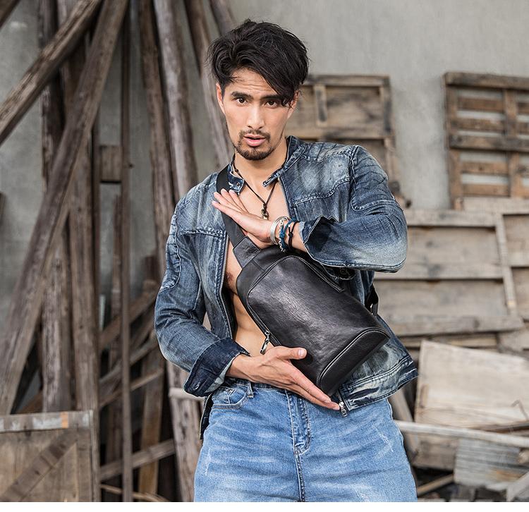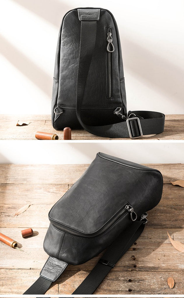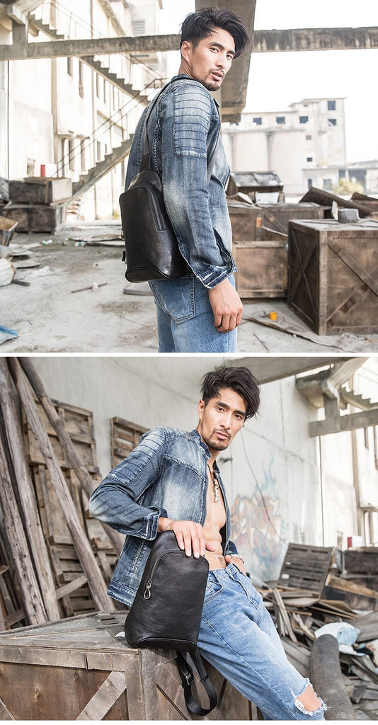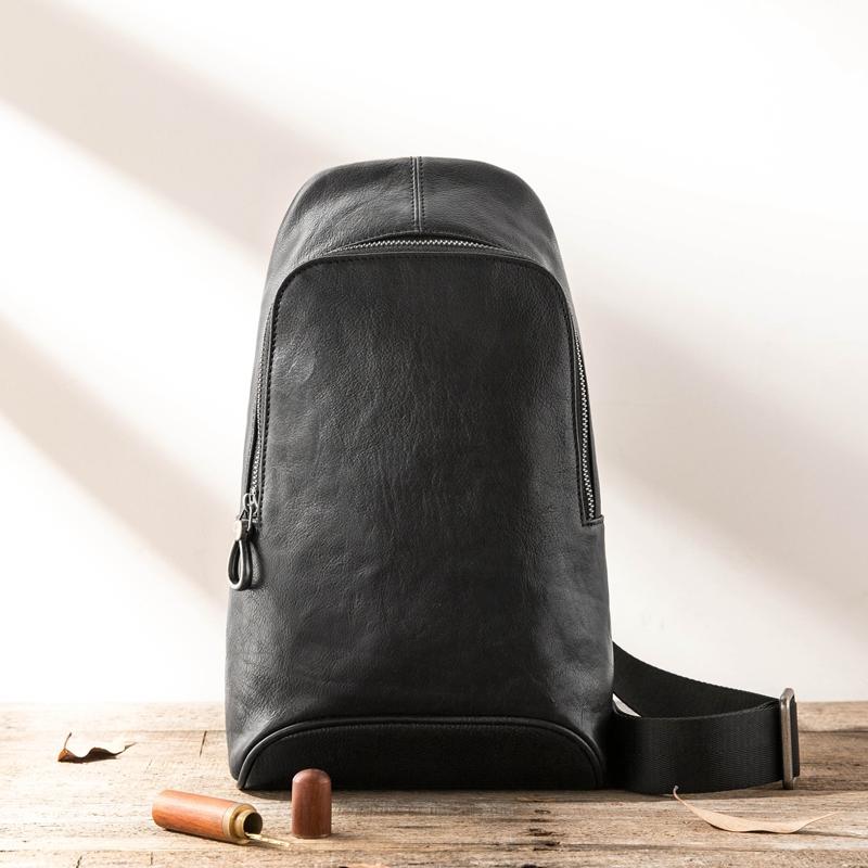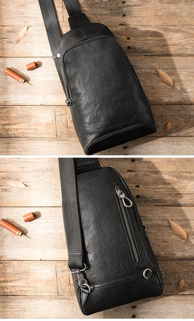Design: Black Casual Leather Mens 10-inches Sports Bag Chest Bag Small Black One Shoulder Backpack for Men