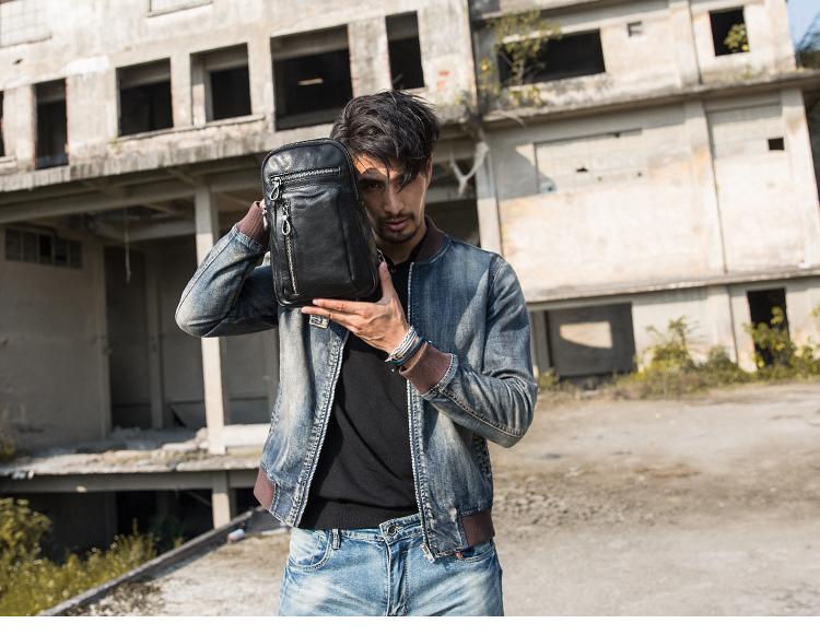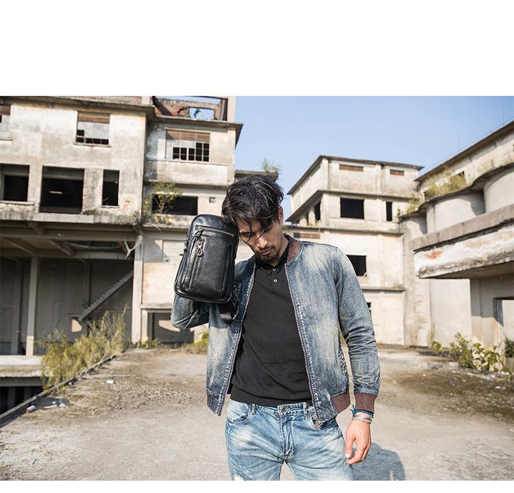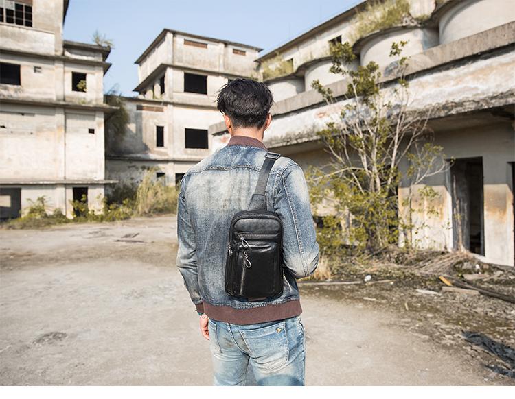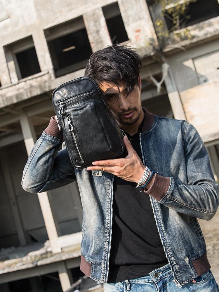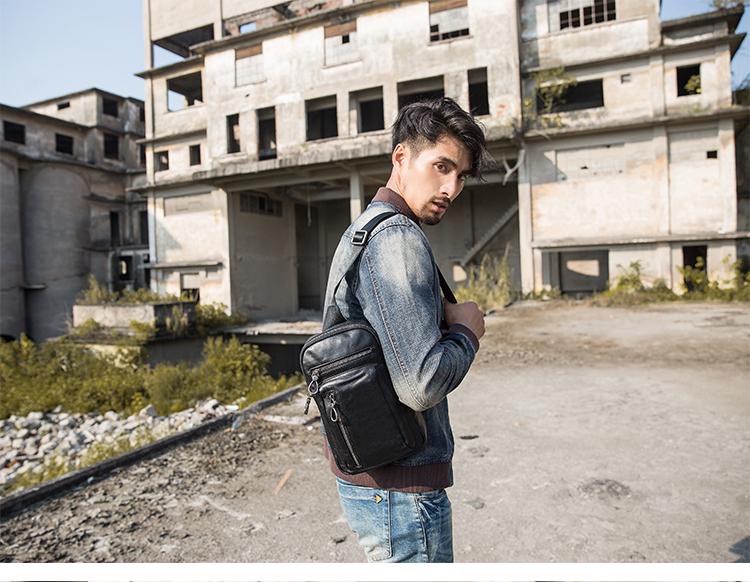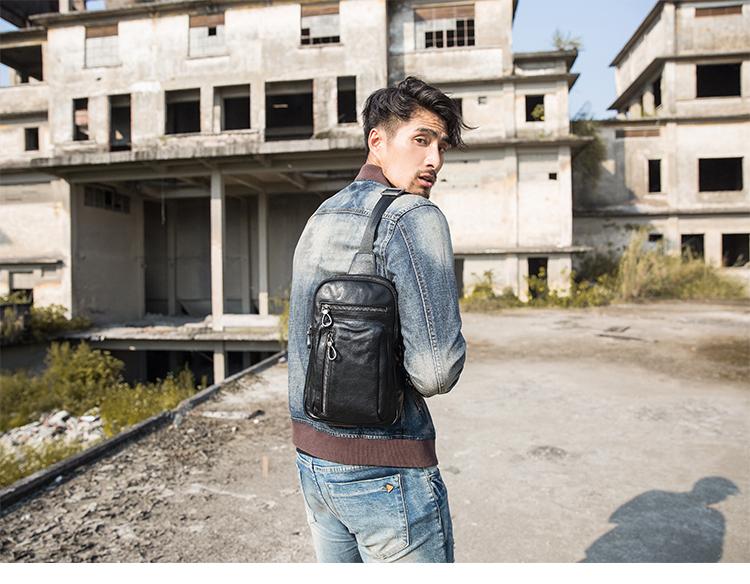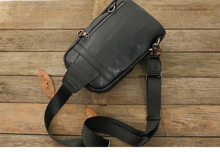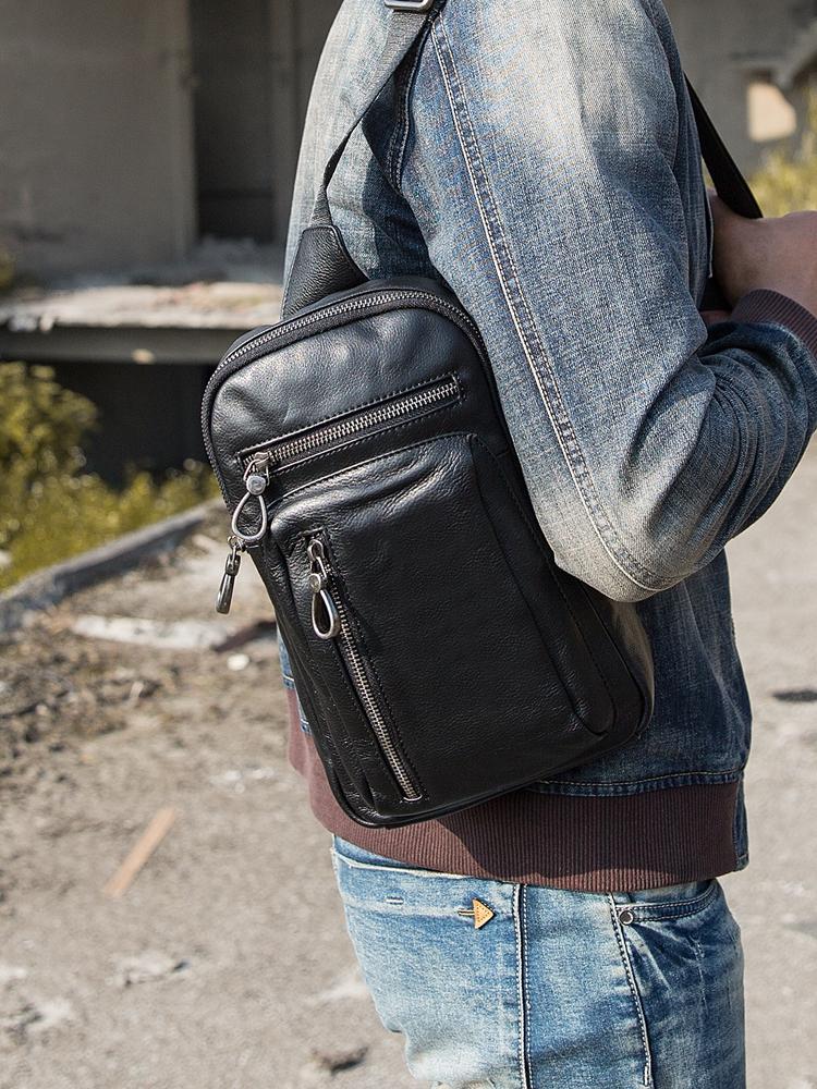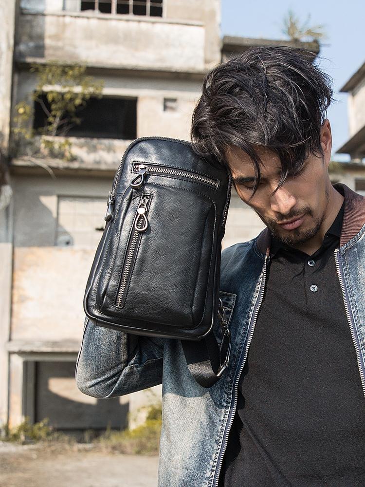 Design: Black Casual Leather Mens 8 inches Sling Bag Chest Bag Black One Shoulder Backpack Phone Bag for Men